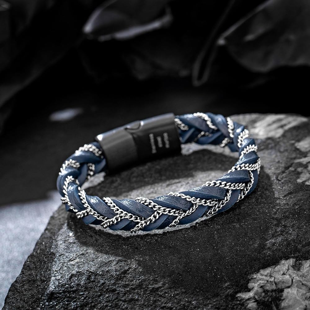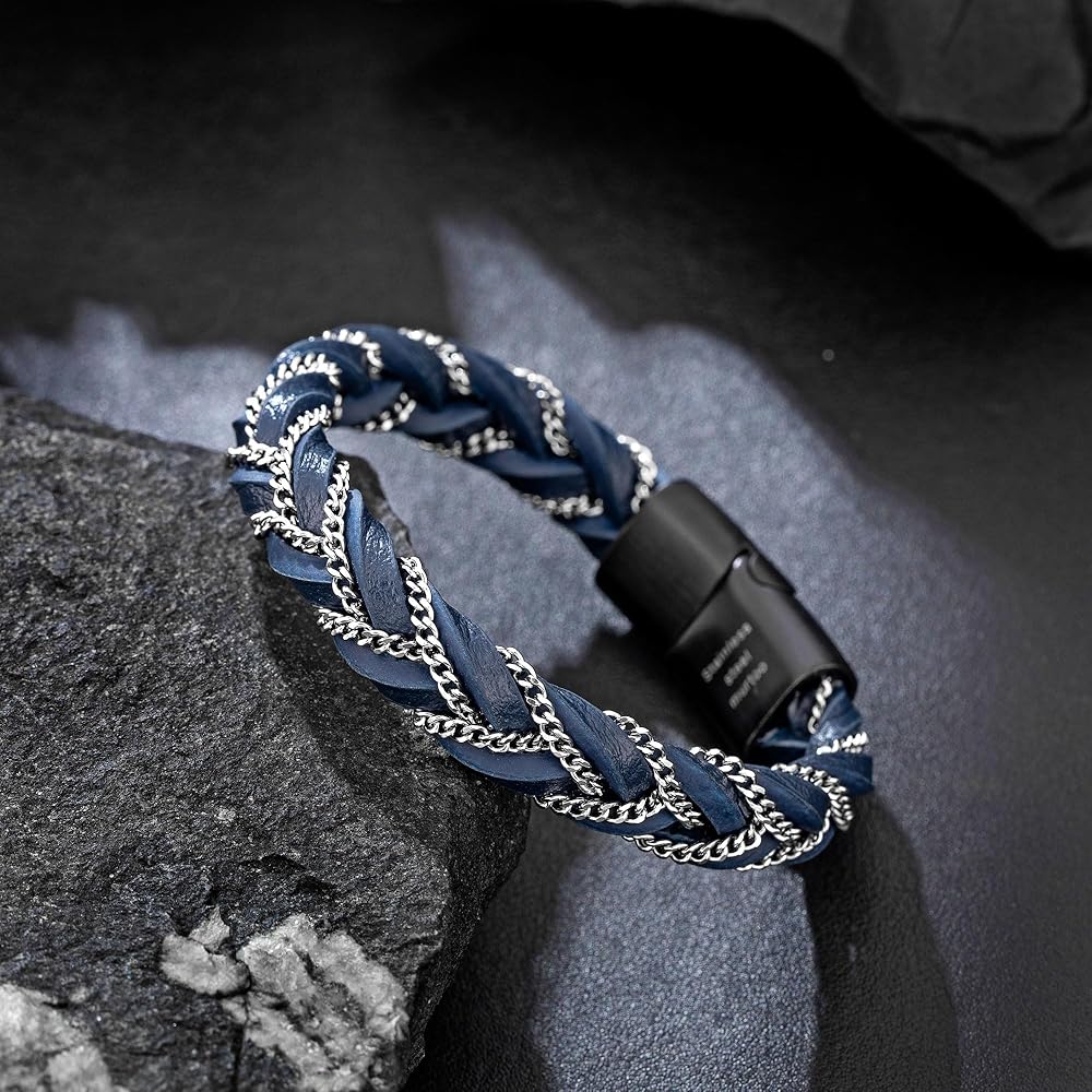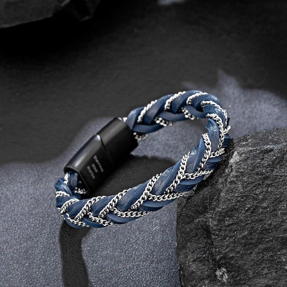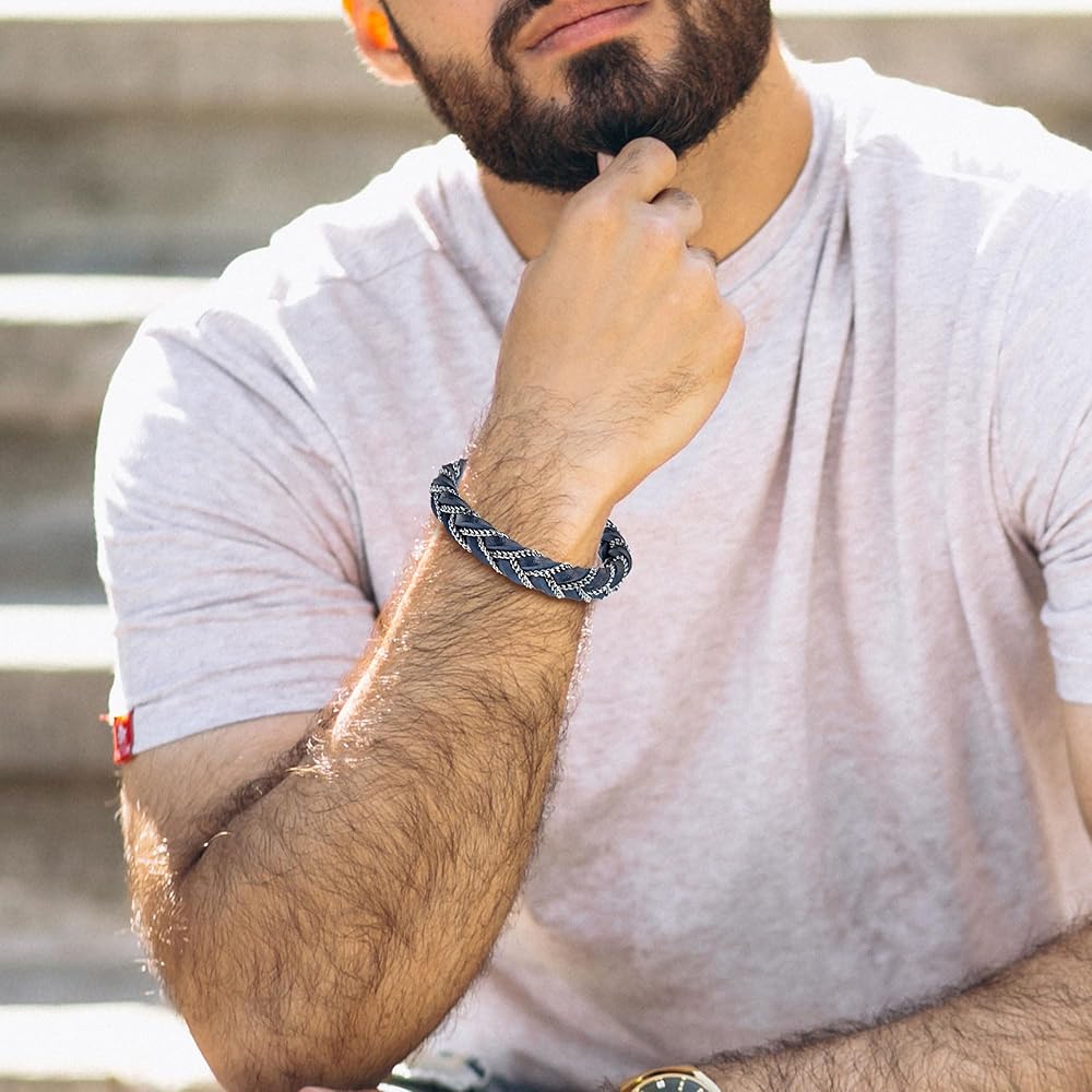 سوار مجدول أنيق: كل سوار جلدي مجدول للرجال مصنوع بعناية بمشبك من الفولاذ المقاوم للصدأ، وسهل الارتداء والخلع. مزيج الجلد الأصلي والسلسلة الفولاذية فريد ومبتكر، قطعة واحدة أنيقة ومتعددة الاستخدامات للرجال، يسهل تنسيقها مع ملابسك اليومية، وتصفيف مظهرك دون عناء وإضافة لمسة عصرية لك.