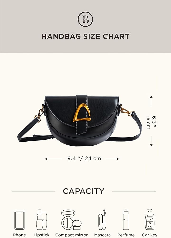 • Capacity: iPhone Pro max, car key, compact mirror, lipstick, mascara and perfume.