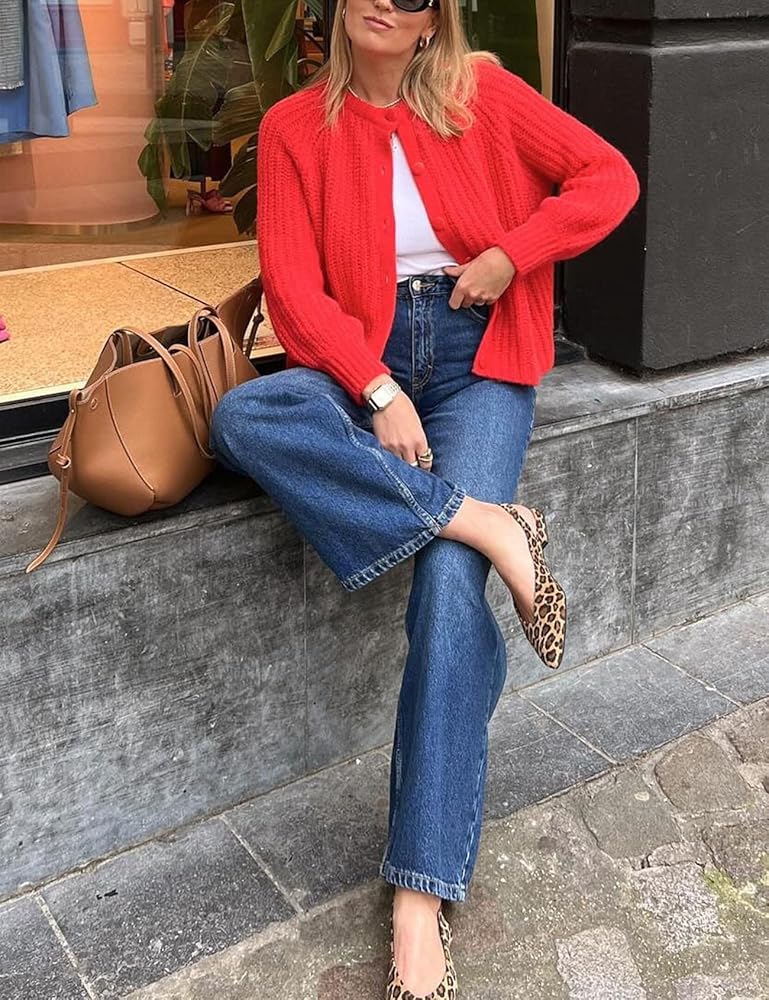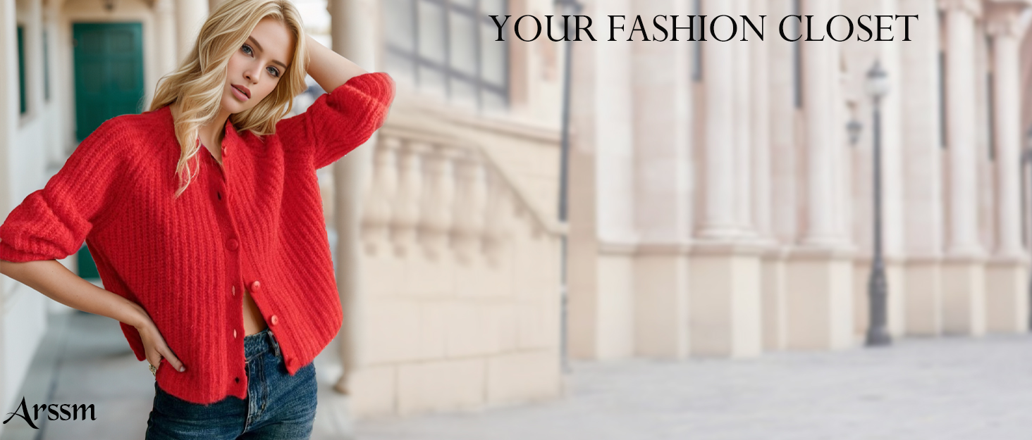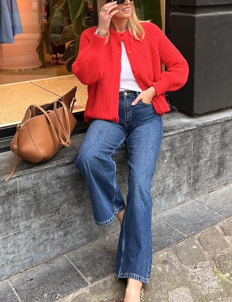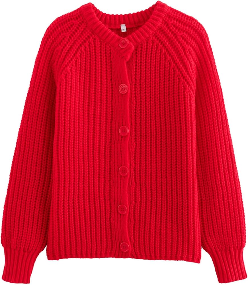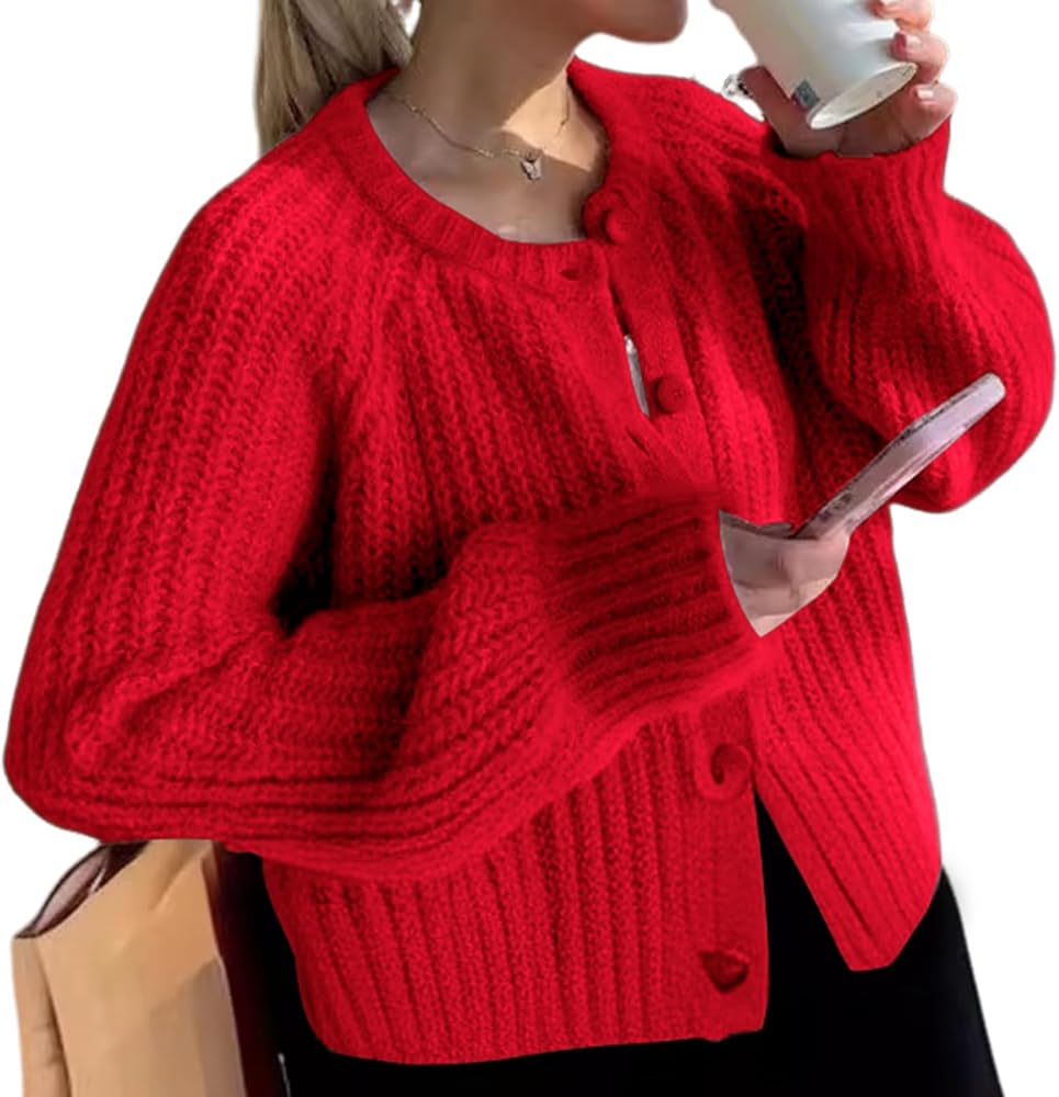 سترة صوفية لطيفة للسيدات من Arssm بأكمام طويلة وفتحة رقبة مستديرة وأزرار سفلية، سترة محبوكة على الموضة 2024 (أحمر-M)