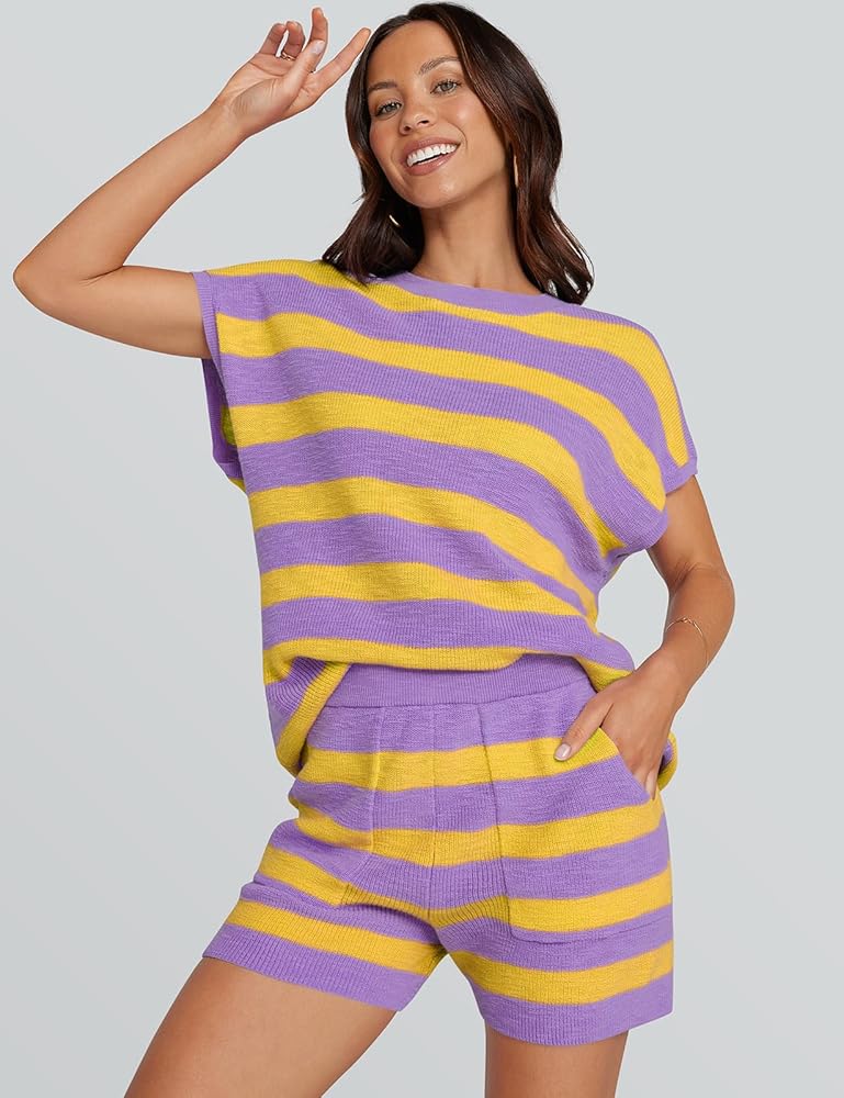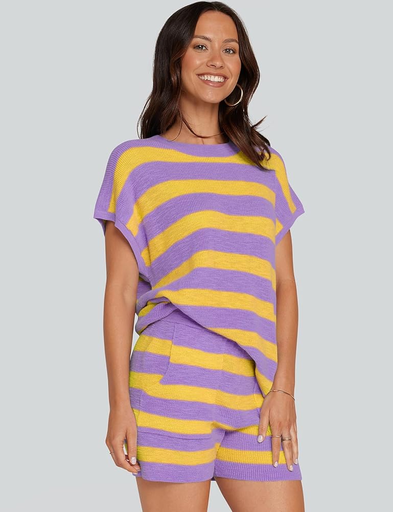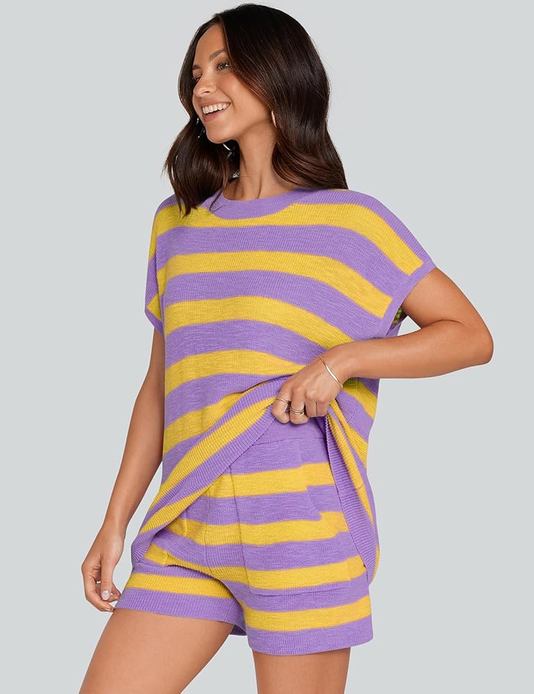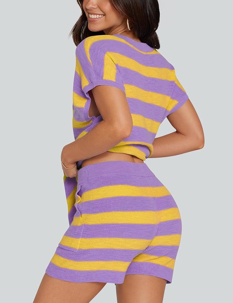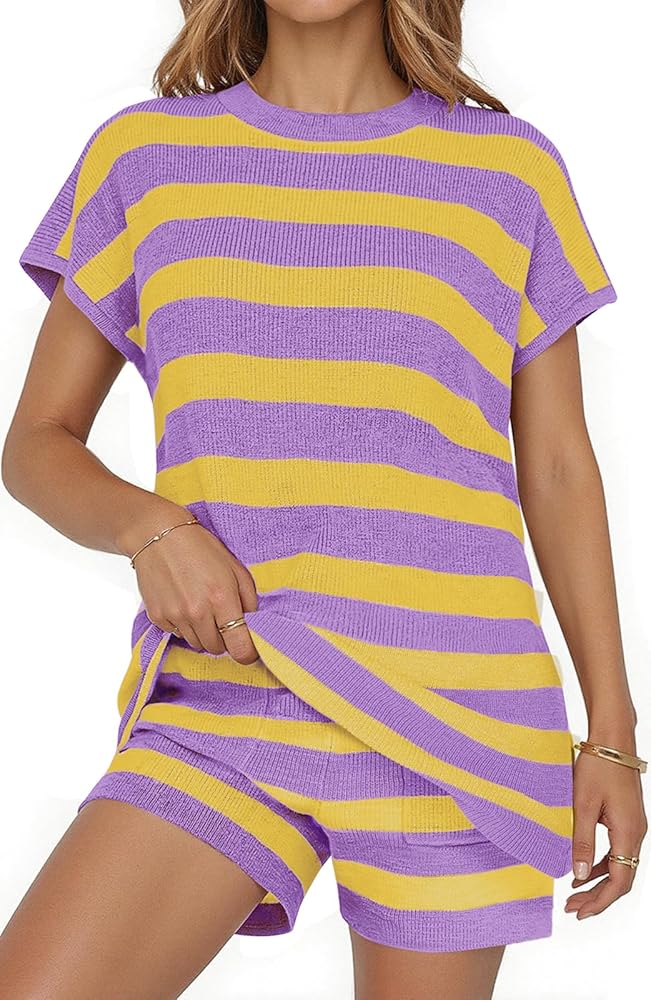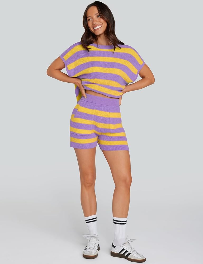 • الميزات: مجموعة سترة متماسكة مخططة مترهلة، مجموعة قصيرة أنيقة. الجزء العلوي كبير الحجم: رقبة واسعة، وأكمام قصيرة منسدلة. الشورت: خصر عالي، حزام خصر مضلع.