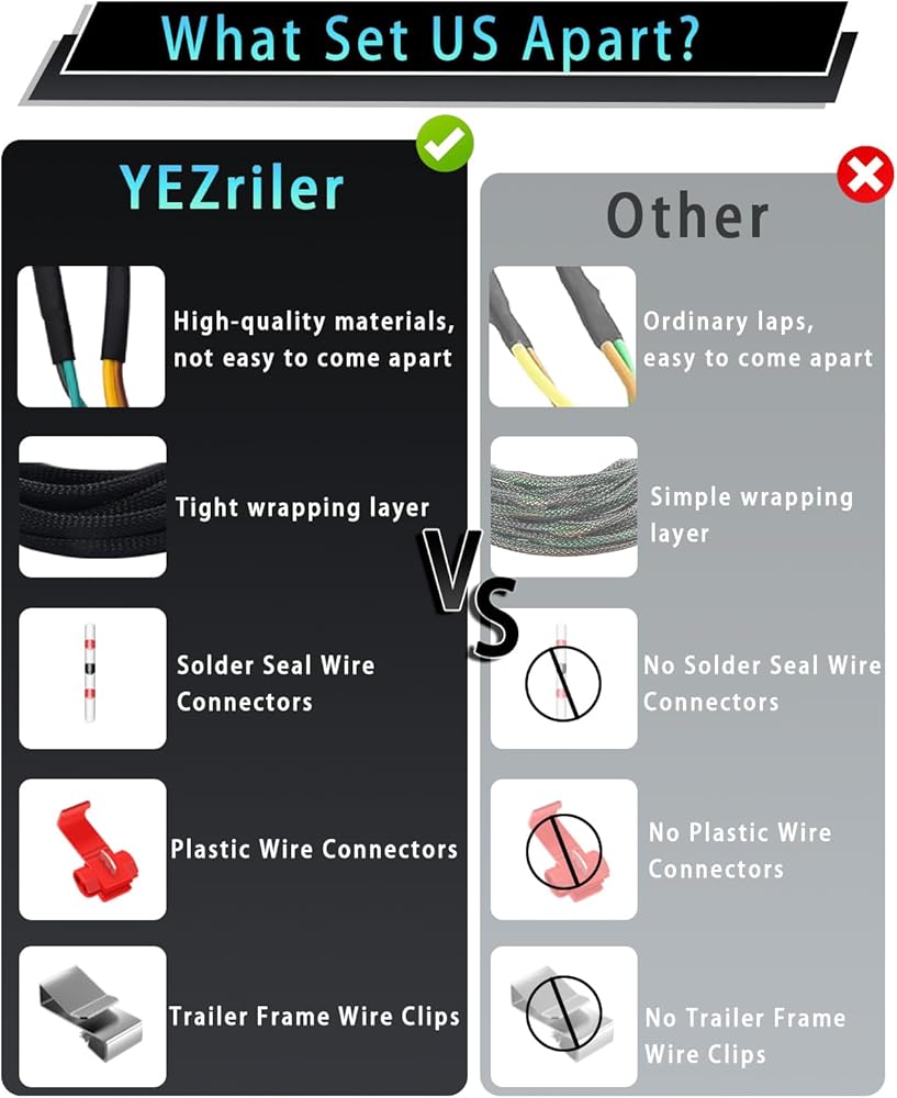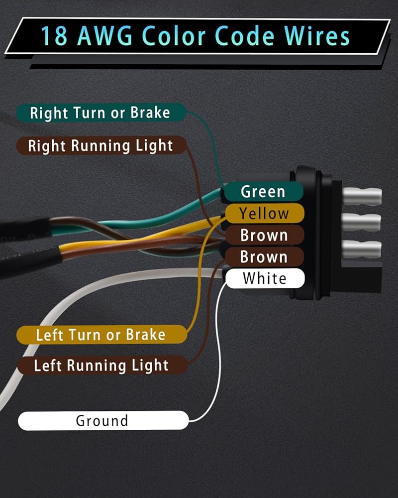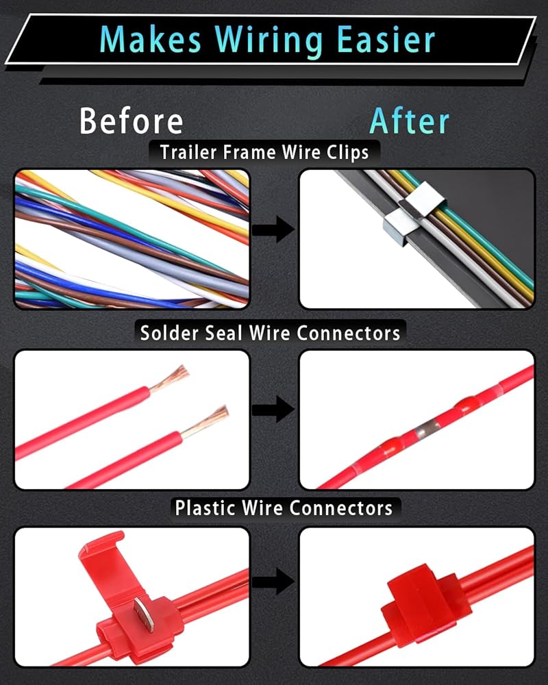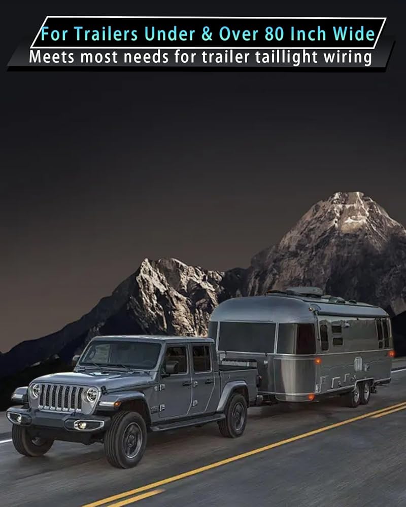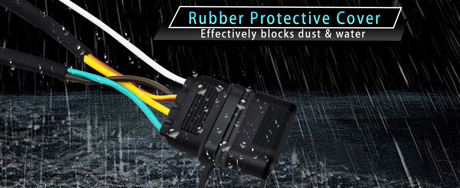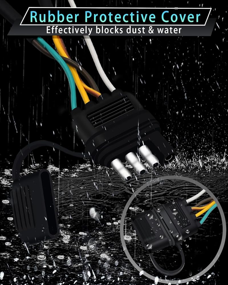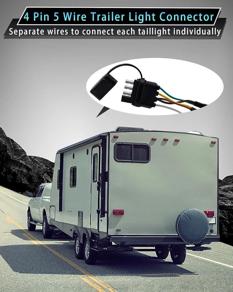 • سلك مرمز بالألوان - موصل مسطح جانبي لسلك المقطورة بأربعة اتجاهات و5 أسلاك يأتي مع أسلاك مرمزة بالألوان، سهل التعرف عليه وسهل التركيب، ويمكن توصيله بسهولة بأسلاك المقطورة الموجودة لتوصيل مصابيح الفرامل وإشارات الانعطاف واليسار واليسار المصابيح الخلفية اليمنى في الجزء الخلفي من المقطورة.