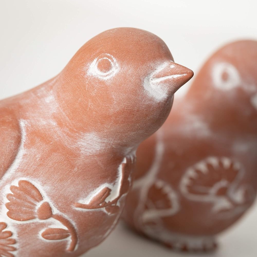 These warm-toned terracotta birds make a lovely accent set for seasonal or everyday display. The birds are made of a pretty brown terra cotta color with a white washed finish and flower accents. Display on a mantel, side table, or as part of a table centerpiece. Birds measure approximately 2.75"L x4.75"W x3.5" . Please see additional images for scale.