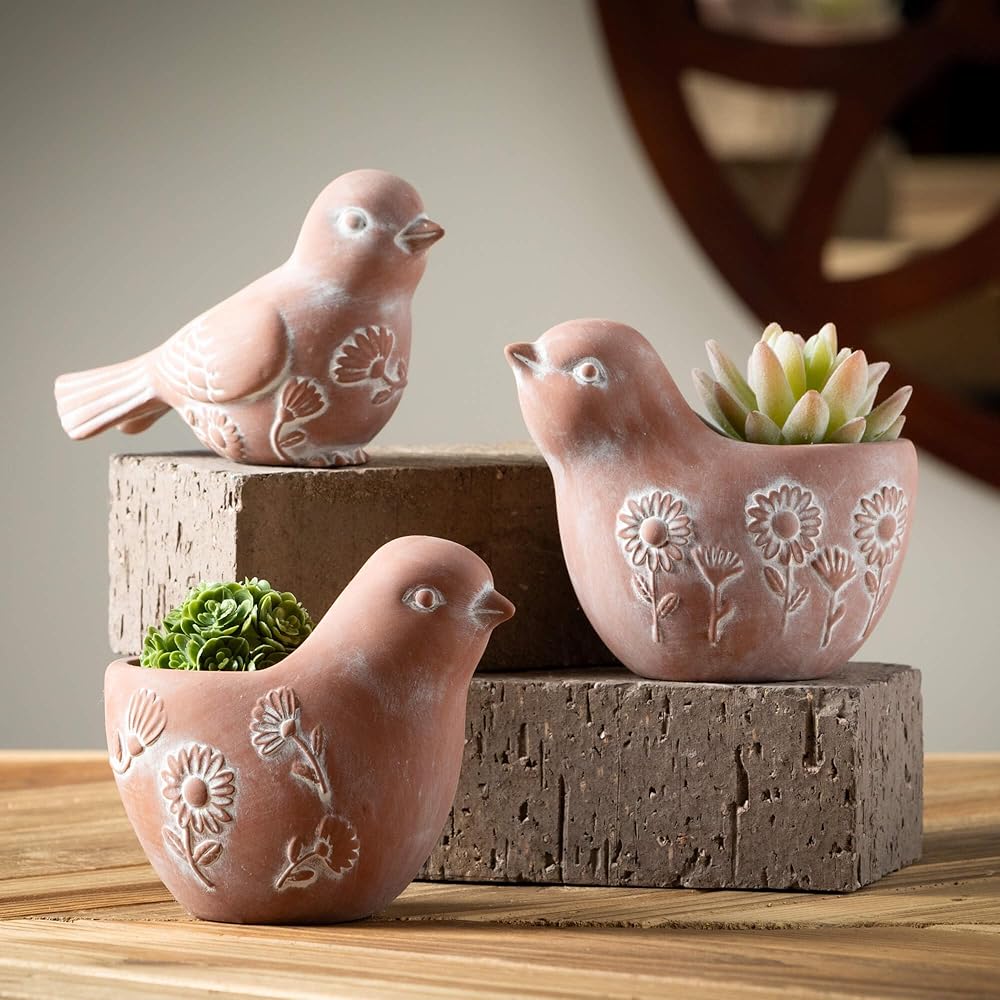 High Quality: These home decor are crafted from brown terracotta with a white-washed finish for a long lasting accent piece. Designed with a floral accents, the terracotta bird figurines keep your decor looking stylish and trendy year after year.