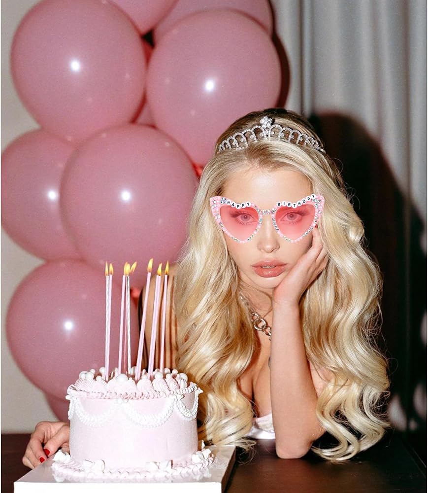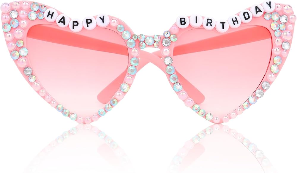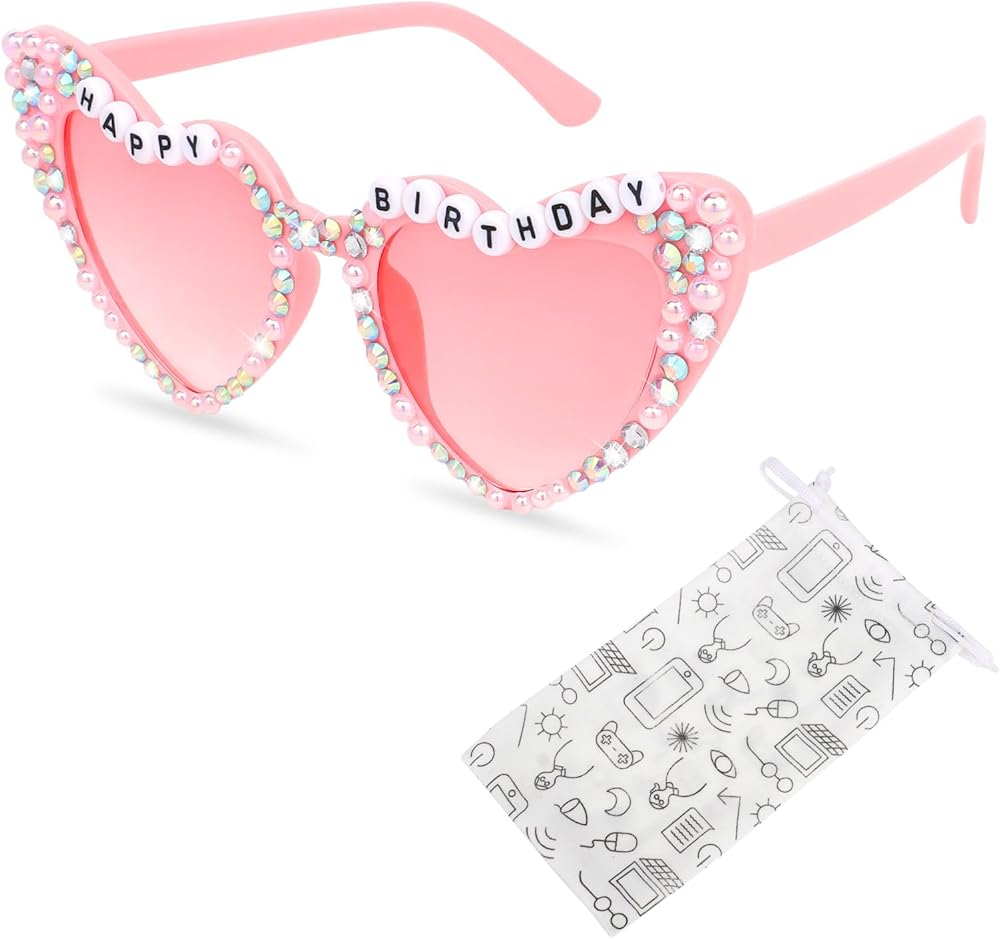 نظارة شمسية لأميرة عيد الميلاد: نظارة شمسية لطيفة على شكل قلب وردي اللون مزينة بالعديد من أحجار الراين الملونة واللؤلؤ الوردي، بالإضافة إلى كلمة "BIRTHDAY PRINCESS"، مما يجعلك تبدو أكثر جمالاً وإبهارًا بين الناس