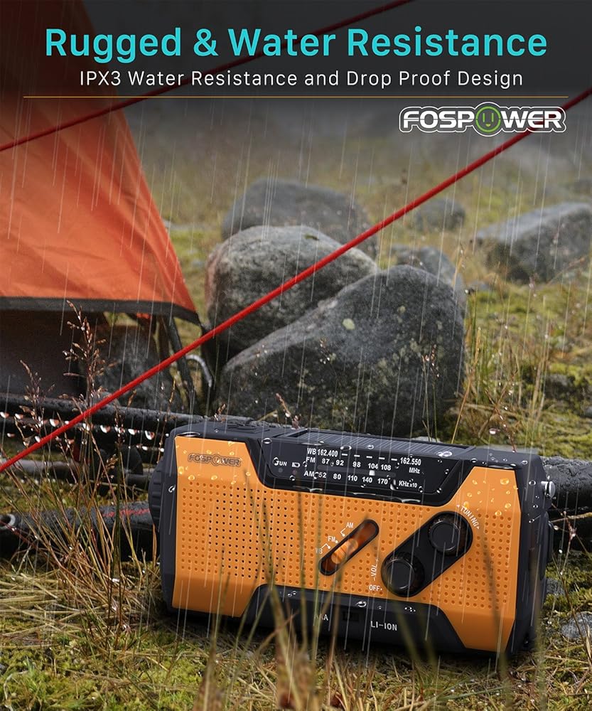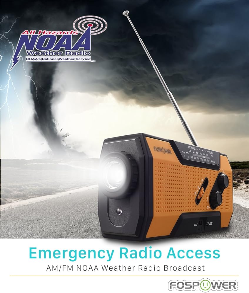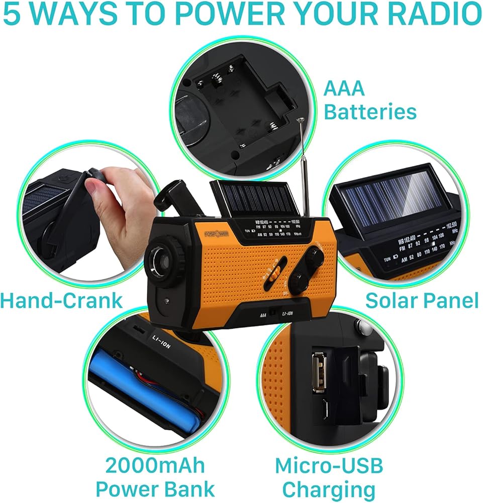 راديو الطقس للطوارئ FosPower (موديل A1) NOAA/AM/FM مع بنك طاقة محمول بقدرة 7400 ميجاوات في الساعة، شحن USB/طاقة شمسية/كرنك يدوي، يعمل بالبطارية، إنذار SOS ومصباح يدوي لحالات الطوارئ الداخلية والخارجية