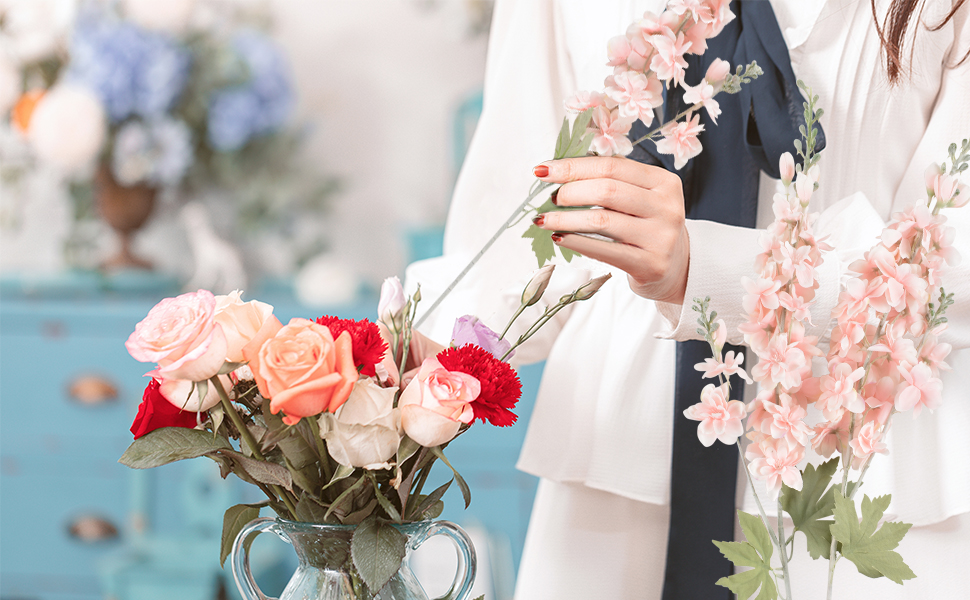 • ديكور مثالي: زهور الدلفينيوم الاصطناعية تبدو جميلة وحيوية. إنها الديكورات المثالية لباقات الزهور التي تصنعها بنفسك، وباقات الزفاف، وقطع الطاولة المركزية، وتزيين حديقة المنزل، وحفلات استقبال العروس، والديكور الخارجي، إلخ.