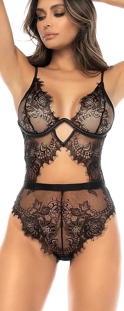 Drape yourself in sophistication with this eyelash lace bodysuit featuring underwire, adjustable straps and crotch fastening.