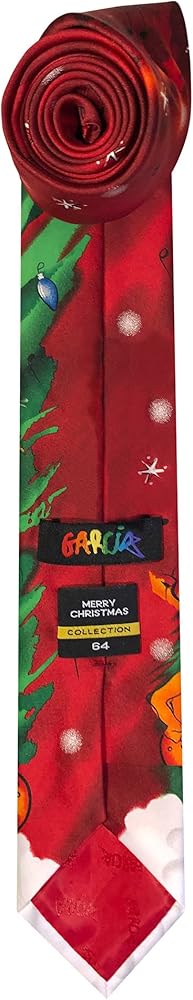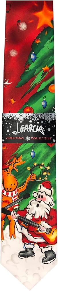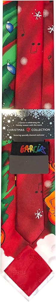 Jerry Garcia Merry Christmas Collection art-in-neckwear neck tie features graphics of Santa Claus and reindeer playing their guitars and tambourine under a green Christmas tree dressed in star, lights, and ornaments, over a snow-filled ground with black musical notes and white stars above on a red background. Entitled Merry Christmas Collection 64. Available in regular classic 58 inch length or extra long 63 inch length. Regular and XL sizes both measure 3.25 inches at its widest point.Jerry Garcia's music has been enjoyed for decades by people of all ages. He was also an accomplished visual artist, painting and drawing throughout his lifetime. Jerry created the J. Garcia neckwear line, overseeing this unique use of his art. Each design is based on one of Jerry's paintings or drawings. The J. Garcia line continues the tradition of quality and value, celebrating the artistic legacy and vision of an extraordinary man.