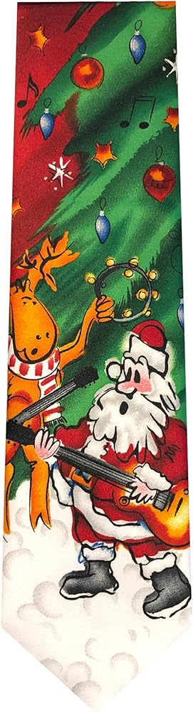 Jerry Garcia men's art-in-neckwear neck tie features graphics of Santa Claus and reindeer playing their guitars and tambourine under a green Christmas tree dressed in star, lights, and ornaments, over a snow-filled ground with black musical notes and white stars above on a red background. Entitled Merry Christmas Collection 64. Part of the Merry Christmas Collection.