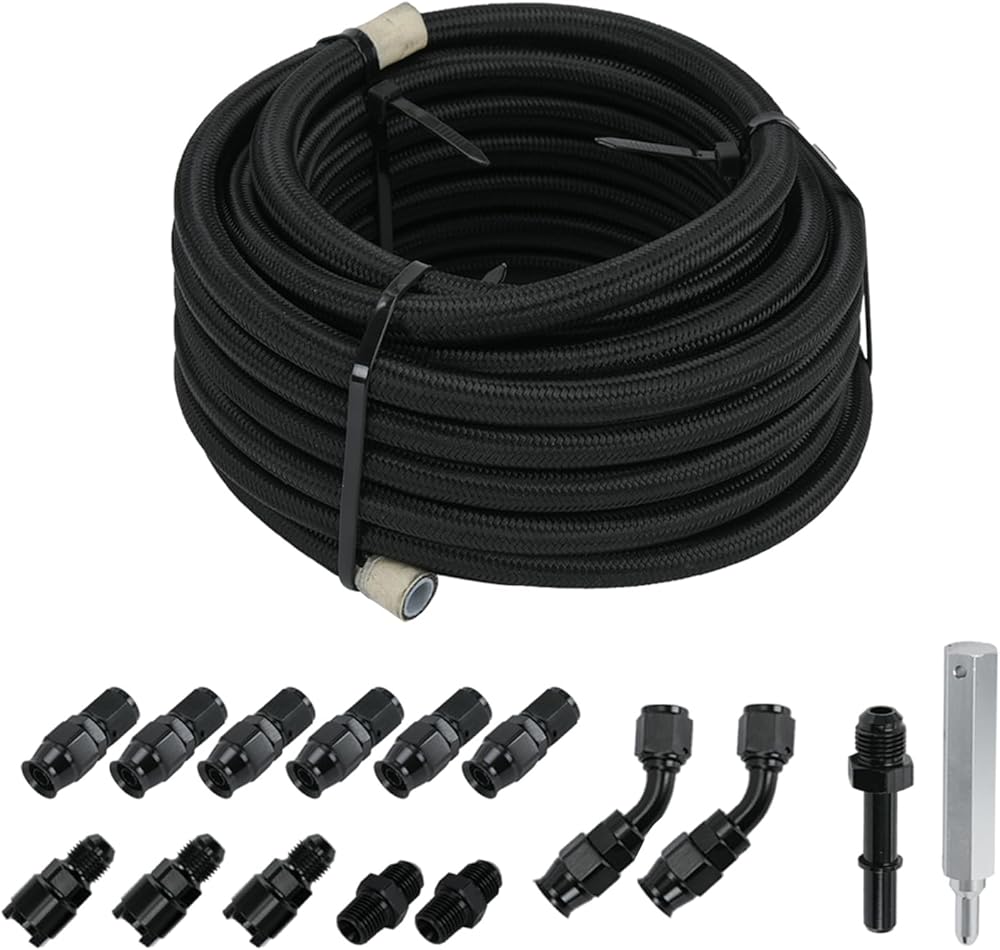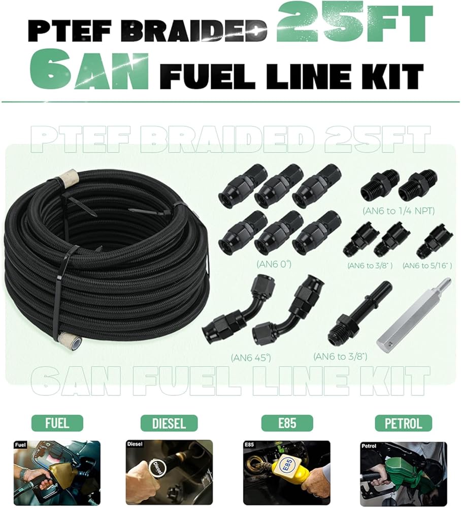 تشمل العبوة: خرطوم وقود 25 قدمًا 6AN × 1، 6AN PTFE طرف خرطوم مستقيم × 6، 6AN PTFE 45 درجة طرف خرطوم × 2، تركيب محول خرطوم 6AN إلى 3/8 بوصة × 2، تركيب محول خرطوم 6AN إلى 1/4 بوصة NPT × 2، AN6 إلى 3/8 "فصل سريع ذكر × 1، 6AN إلى 5/16" تركيب محول خرطوم × 1.