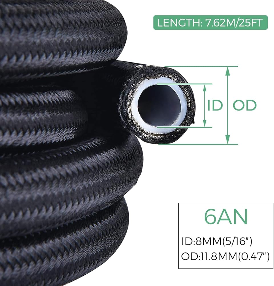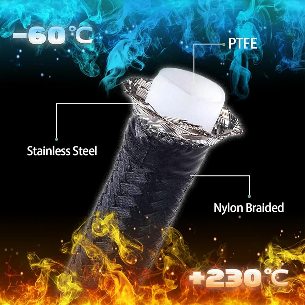 معرف نطاق درجة حرارة العمل: -76 درجة فهرنهايت إلى 446 درجة فهرنهايت (-60 درجة مئوية إلى 230 درجة مئوية). الحد الأقصى لضغط العمل: 3000 رطل لكل بوصة مربعة. ضغط الانفجار: 10000psi. خط الوقود PTFE ذو الضغط العالي المضفر من الفولاذ المقاوم للصدأ AN-6 يتحمل بشكل أقوى بكثير الحرارة والظروف القاسية. خط الوقود: حوالي 5/16". القطر الخارجي لخط الوقود: حوالي 0.465"