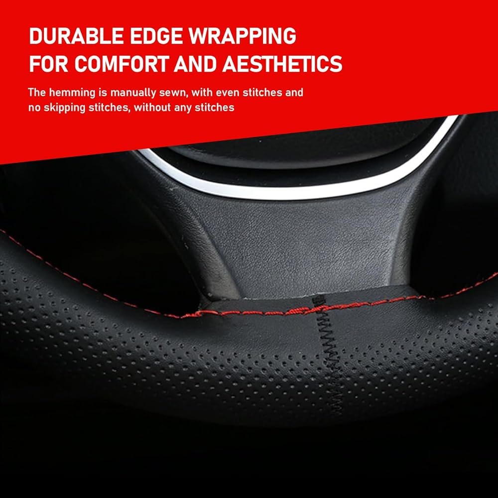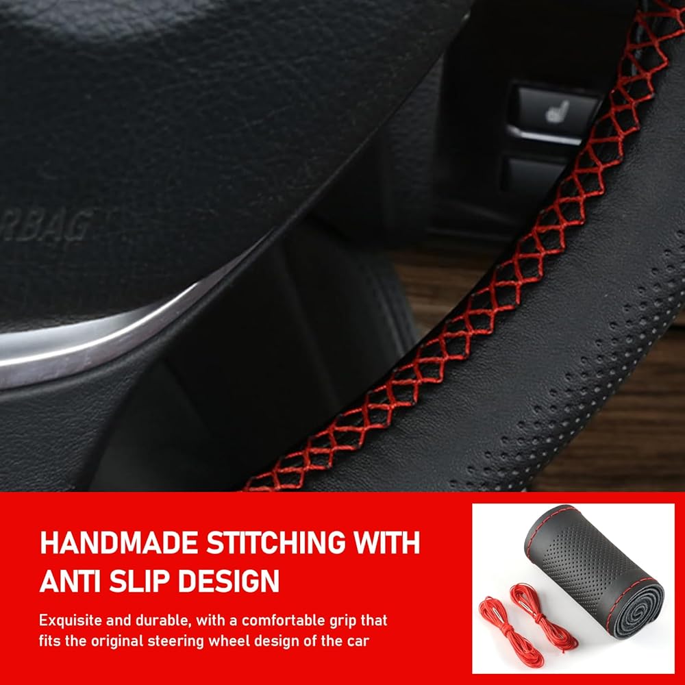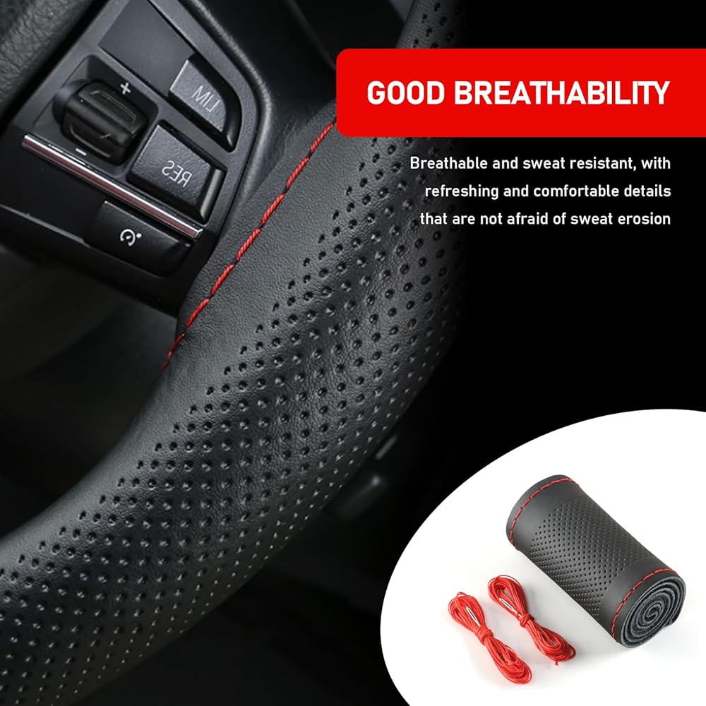 ZBGUN Pack-1 Car Steering Wheel Cover, 14.9" Leather Anti-scratch Protective Cover for All Seasons, Breathable Non-slip Easy-to-hold Cover with DIY Wiring Harness, Universal for Cars (Black & Red)