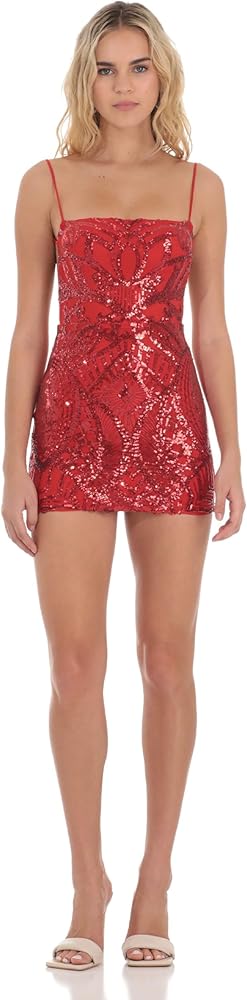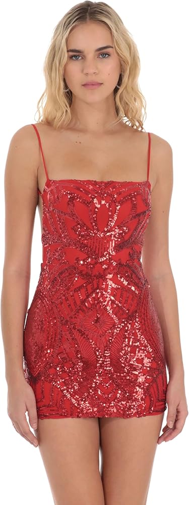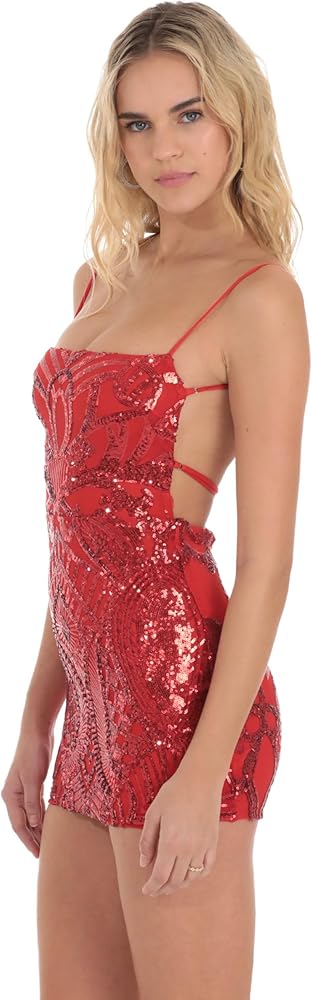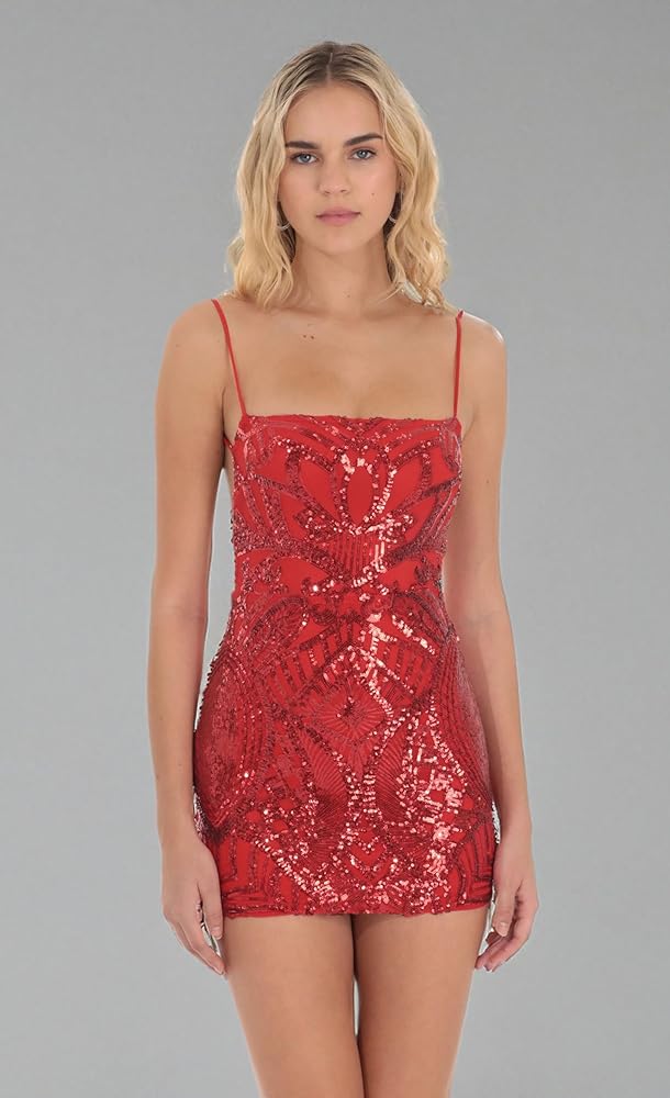 فستان كوكتيل قصير نسائي بترتر أحمر: تجريدي من خشب الماهوجني، قصة ضيقة، بدون أكمام، رقبة مربعة، وظهر مفتوح