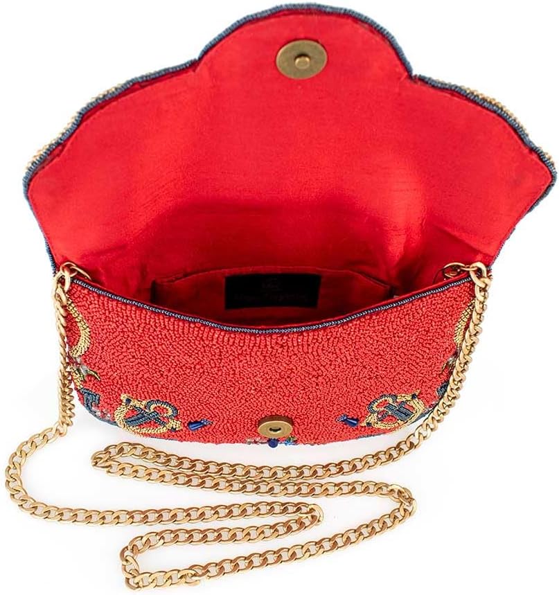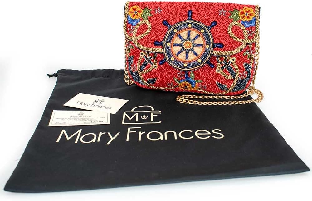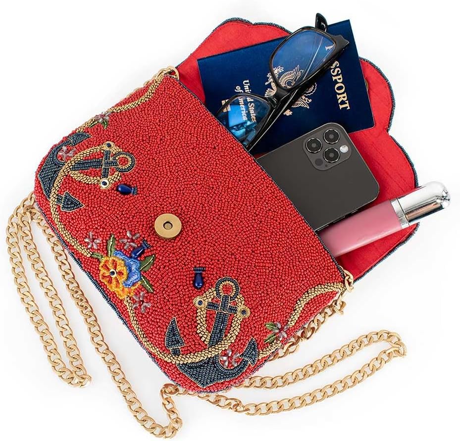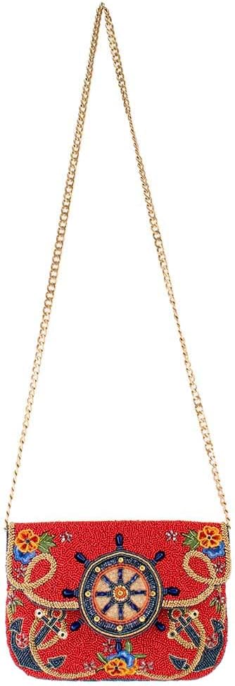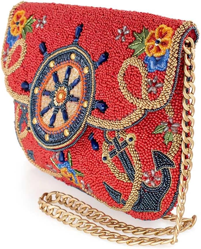 Set sail in style with this handbag, featuring a bold, beaded ship's wheel at its center. Anchored with intricate designs, colorful flowers, and sparkling accents, this nautical-inspired bag is perfect for those who dream of adventure on the high seas. With its vibrant red background and luxurious gold chain, it's the ultimate accessory for any fashion-forward explorer!