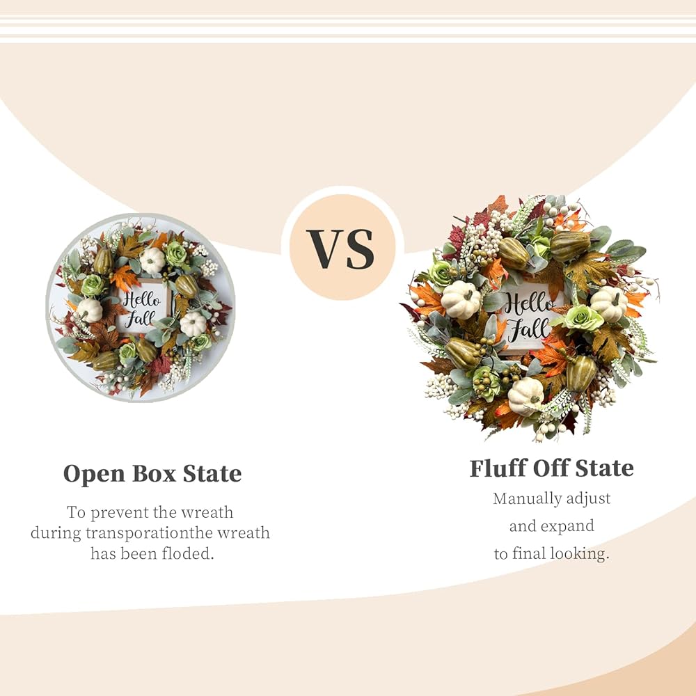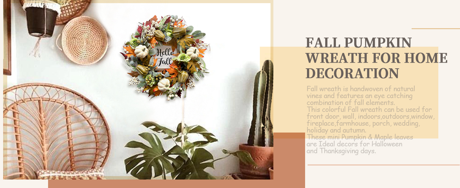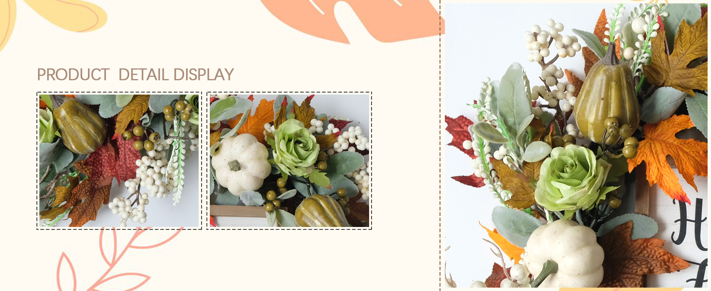 • مناسبات مختلفة: يمكن استخدام إكليل الخريف الملون هذا في الباب الأمامي، والجدار، والداخل، والخارج، والنافذة، والمدفأة، والمزرعة، والشرفة، وحفلات الزفاف، والعطلات، والخريف. تعتبر أوراق اليقطين والقيقب الصغيرة هذه ديكورات مثالية لأيام الهالوين وعيد الشكر.