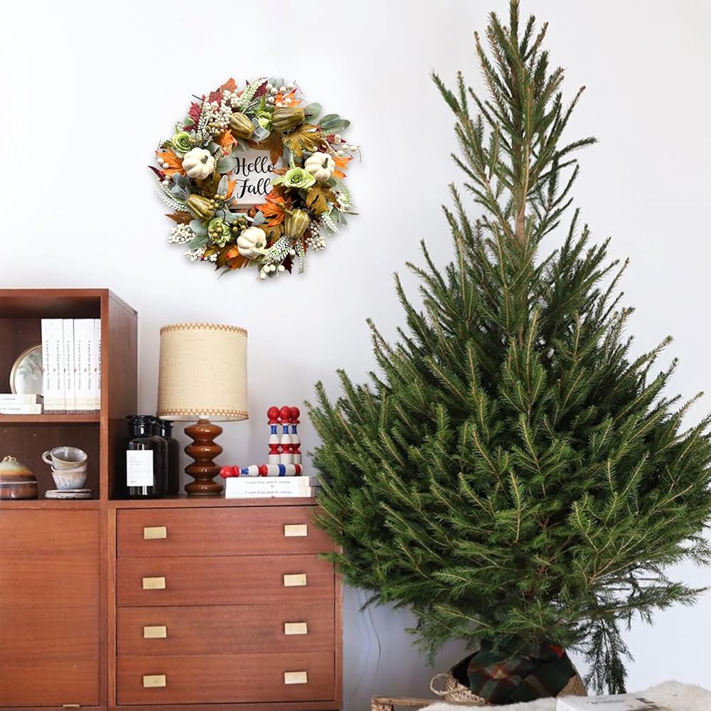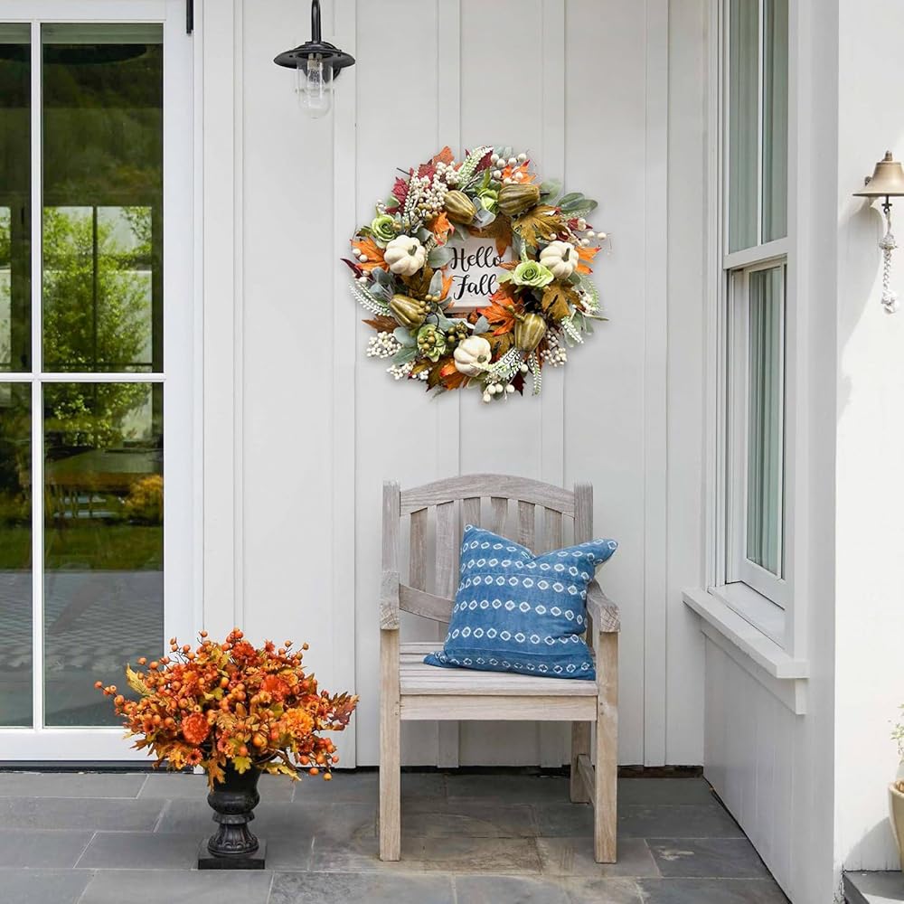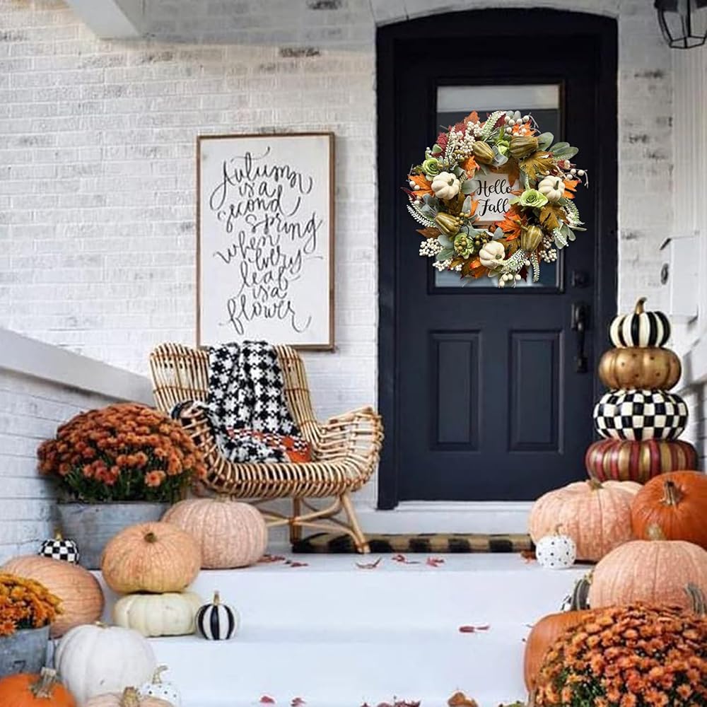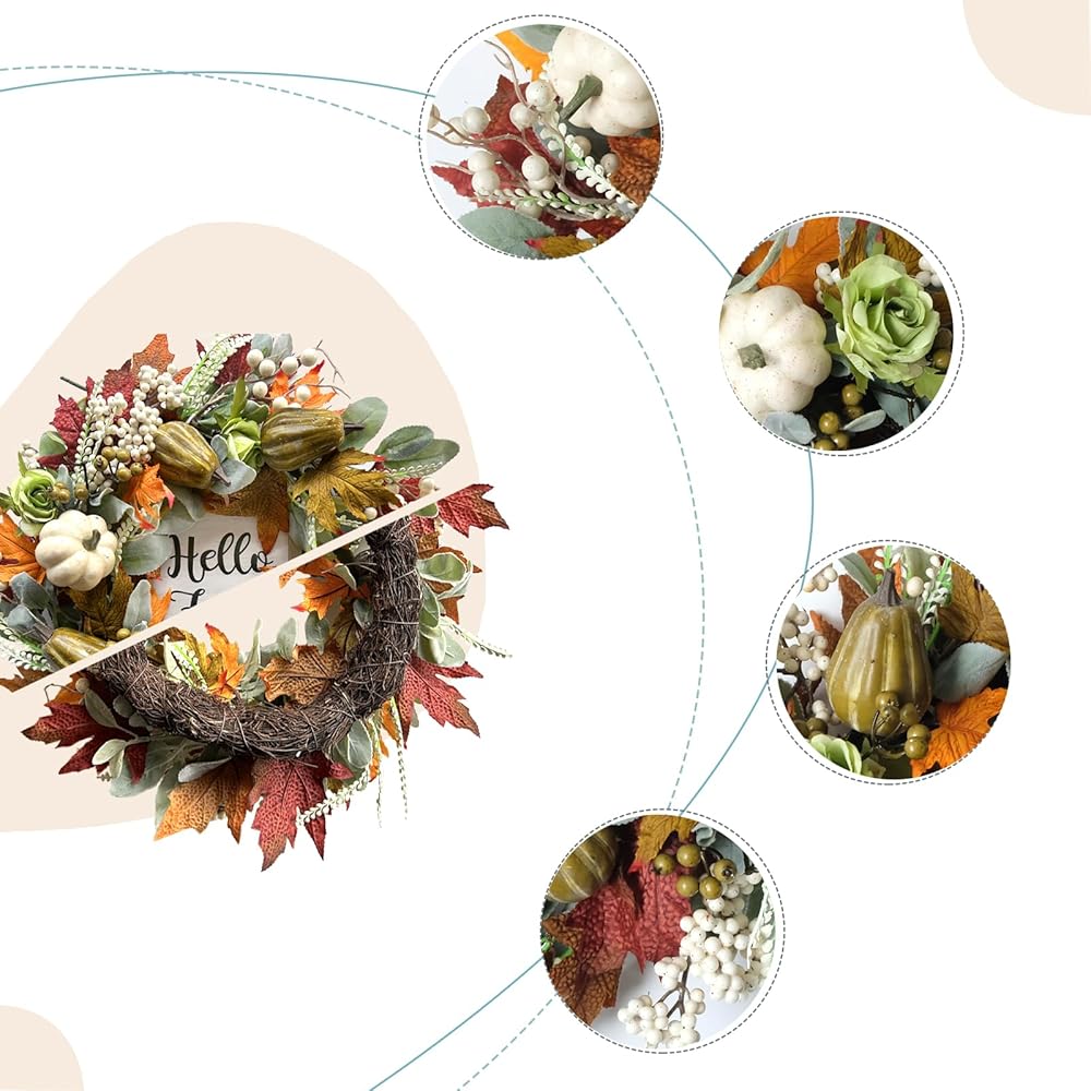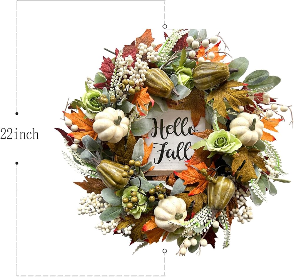 bibelot مرحبا الخريف اكليلا من الزهور 22 '' الخريف الباب الأمامي اكليلا من الزهور، اكليلا من الزهور الحصاد مع مجموعة اليقطين المختلفة من التوت أوراق القيقب مخاريط الصنوبر للجدار الداخلي الخارجي عيد الشكر الخريف الخريف ديكور