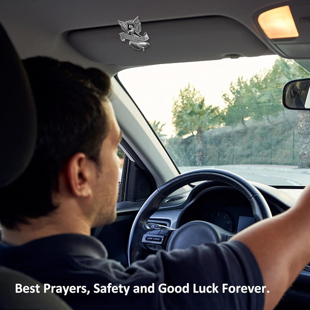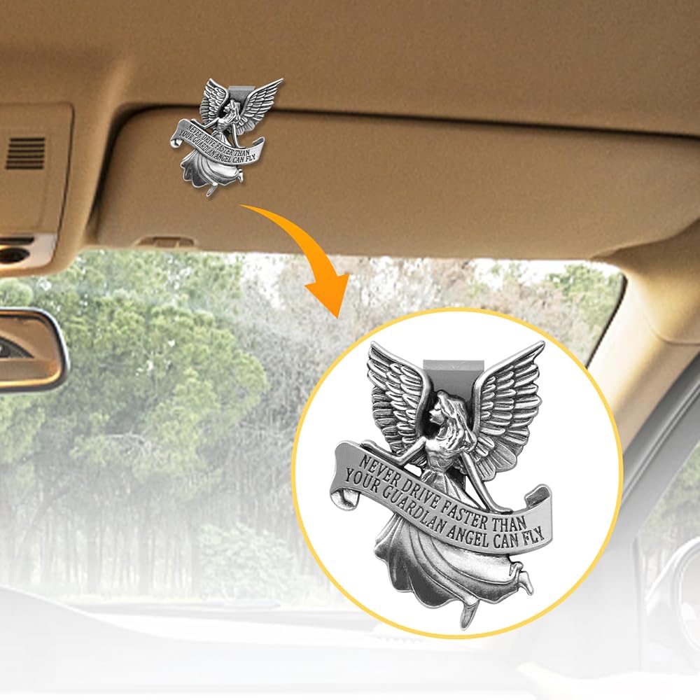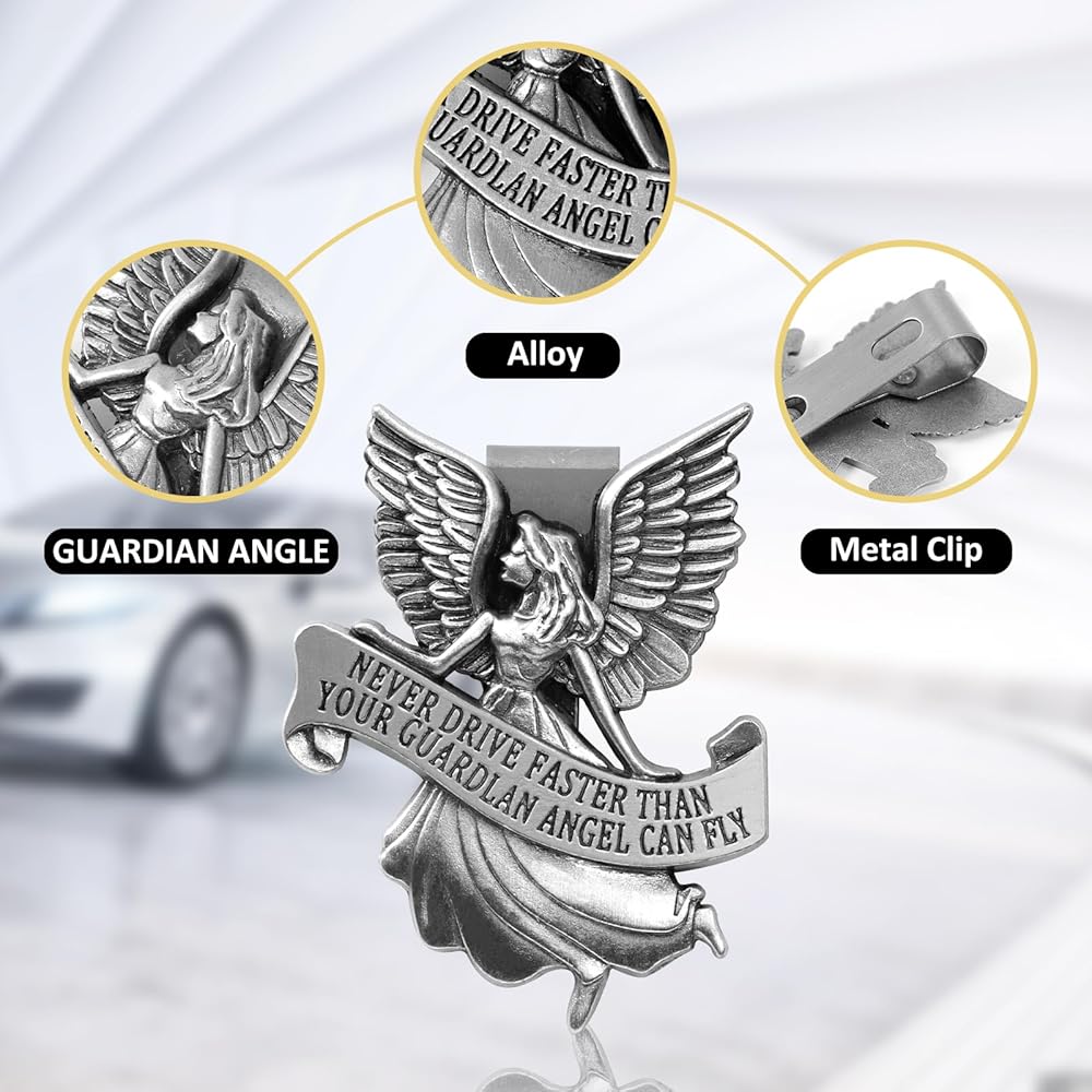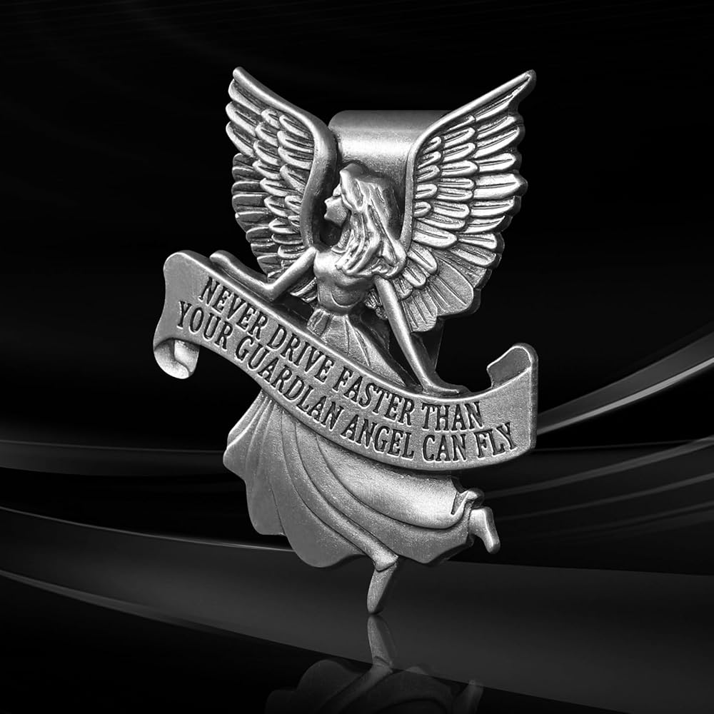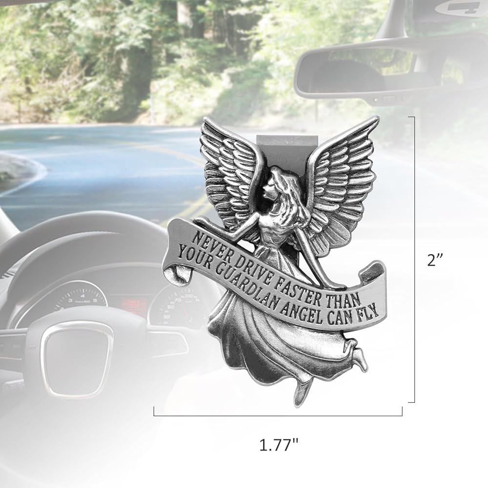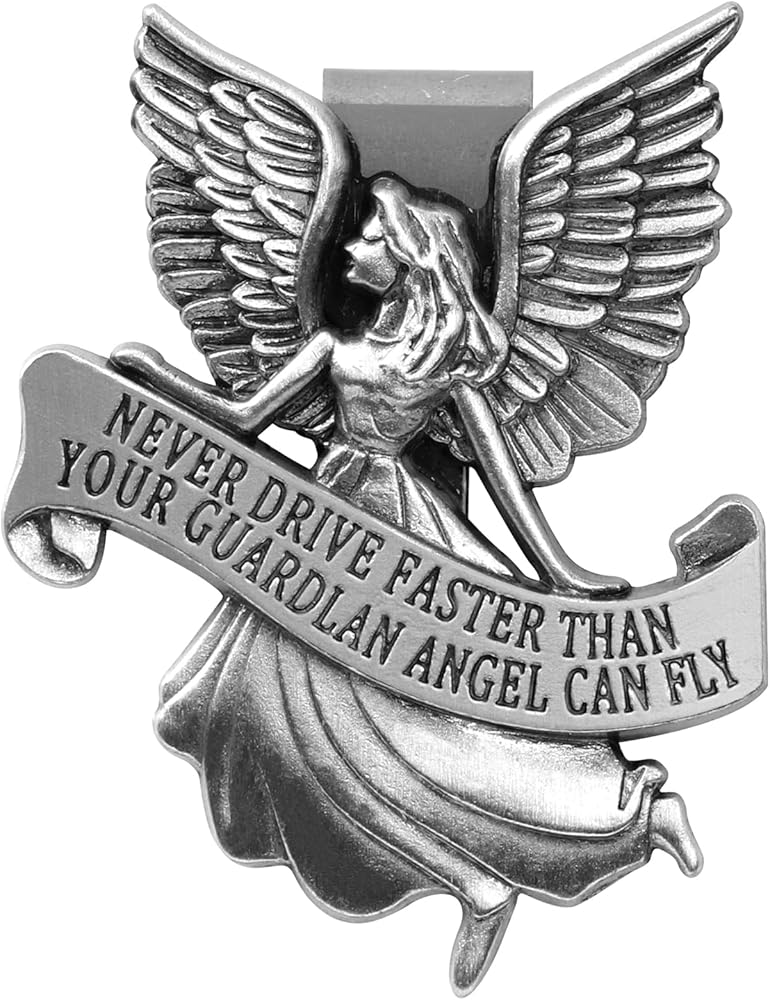 سلامة قيادة الصلاة - كلمة "لا تقود أبدًا أسرع من زاوية الحارس الخاصة بك التي يمكن أن تطير" منقوشة على مشبك قناع الملاك الحارس للسيارة بميدالية سانت كريستوفر، والذي سيبارك السائق أثناء القيادة