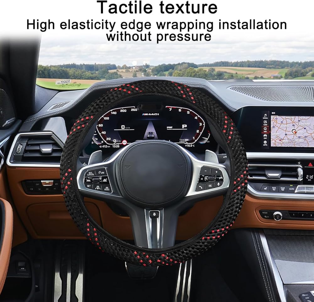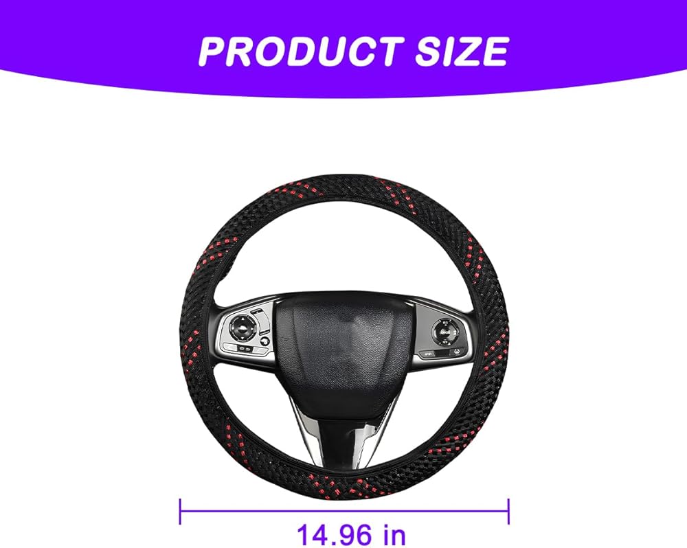 【Exquisite Workmanship】: The ice silk vehicle steering wheel cover has exquisite workmanship. Its alignment is very neat and tidy, and the threads are carefully used, neither broken nor skipped. Moreover, it shows quality ergonomic design, more intimate, so that your grip is more comfortable.