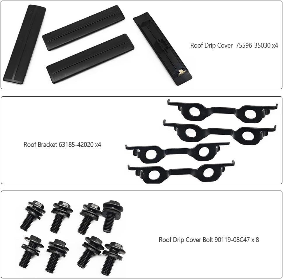 • Package Includes: 4* Roof Drip Cover (75596-35030), 4* Roof Bracket (63185-42020), 8* Roof Drip Cover Bolt (90119-08C47)