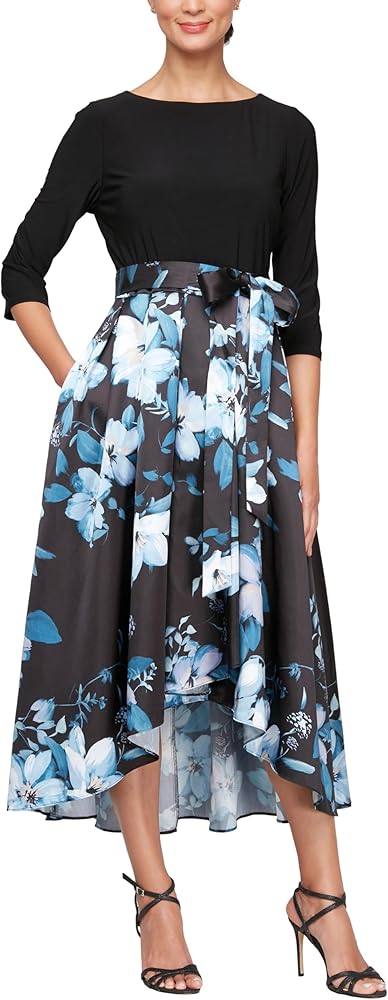 Elegant Design: Features a fitted bodice with 3/4 sleeves, a self-belted tie at the waist, and a high-low hemline for a flattering and stylish look.
