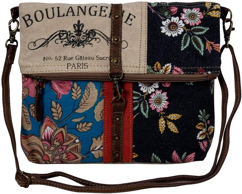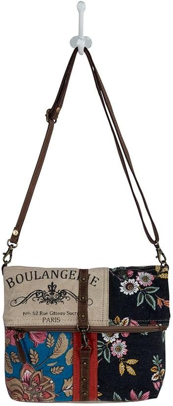 This unique bag has a charming array of design elements that delight the eye. It features a patchwork collection of floral and woven canvas section, all highlighted by leather and brad accents. Zipper-close top, zippered back pocket, and dark chocolate detachable, adjustable leather shoulder strap.