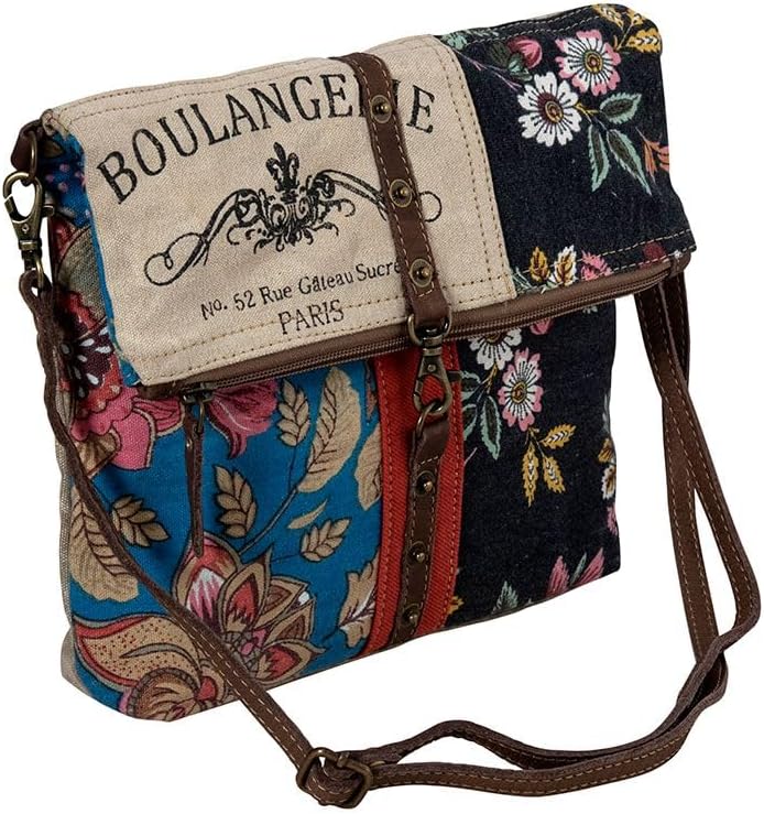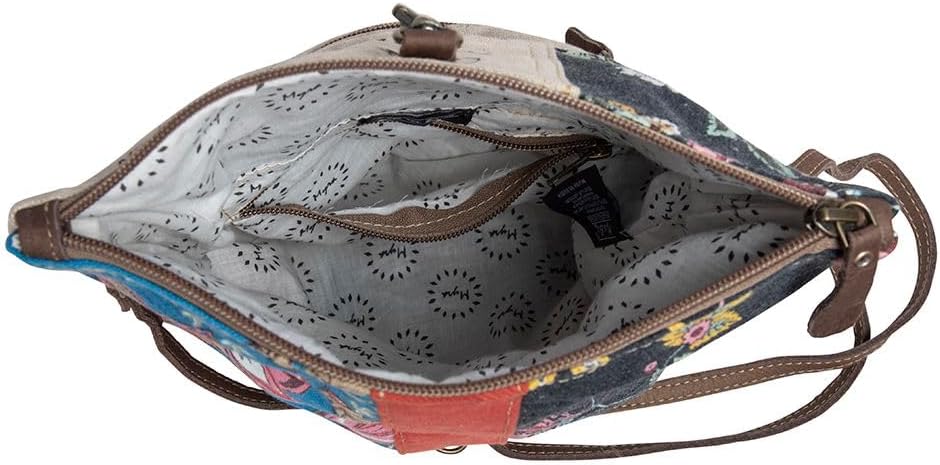 UPCYCLED FASHION BAG - It features a patchwork collection of floral and woven canvas section, all highlighted by leather and brad accents. Zipper-close top, zippered back pocket, and dark chocolate detachable, adjustable leather shoulder strap.
