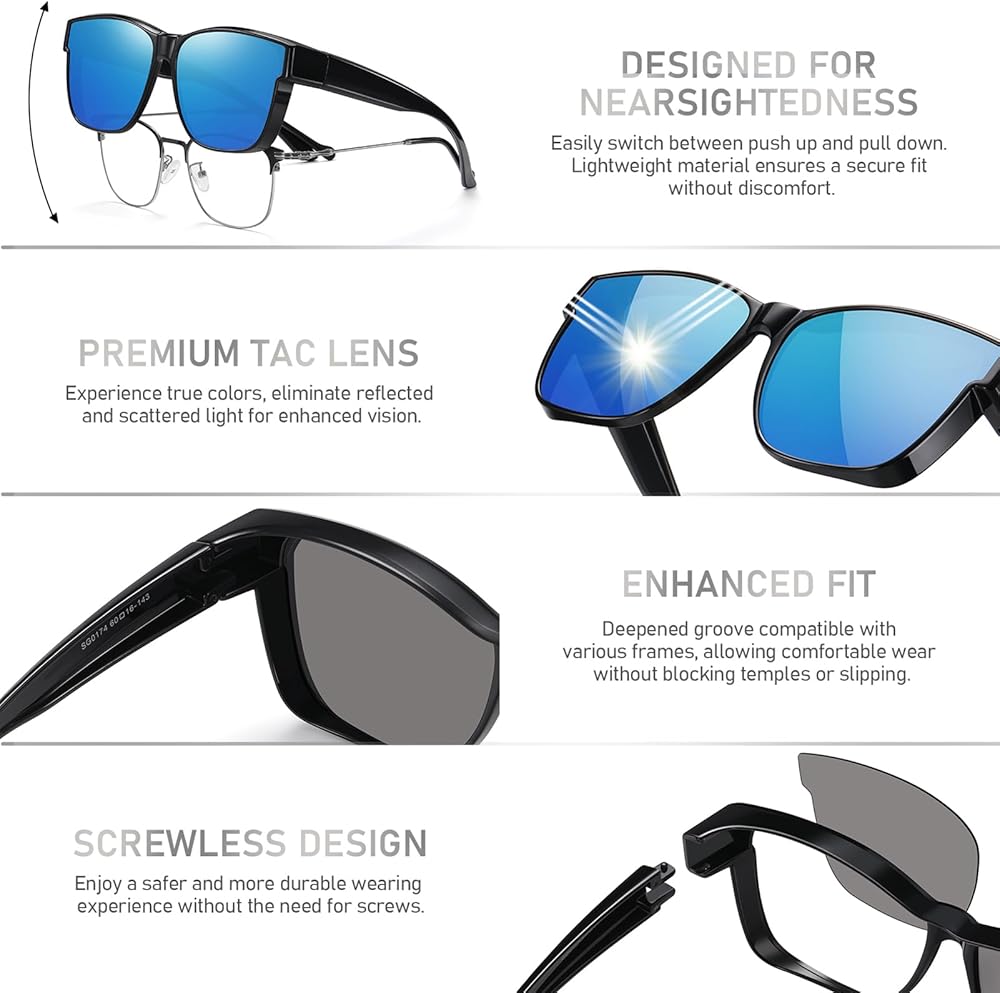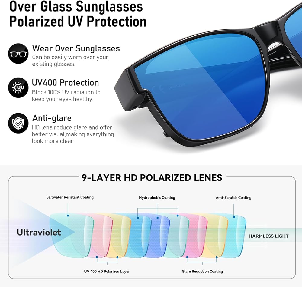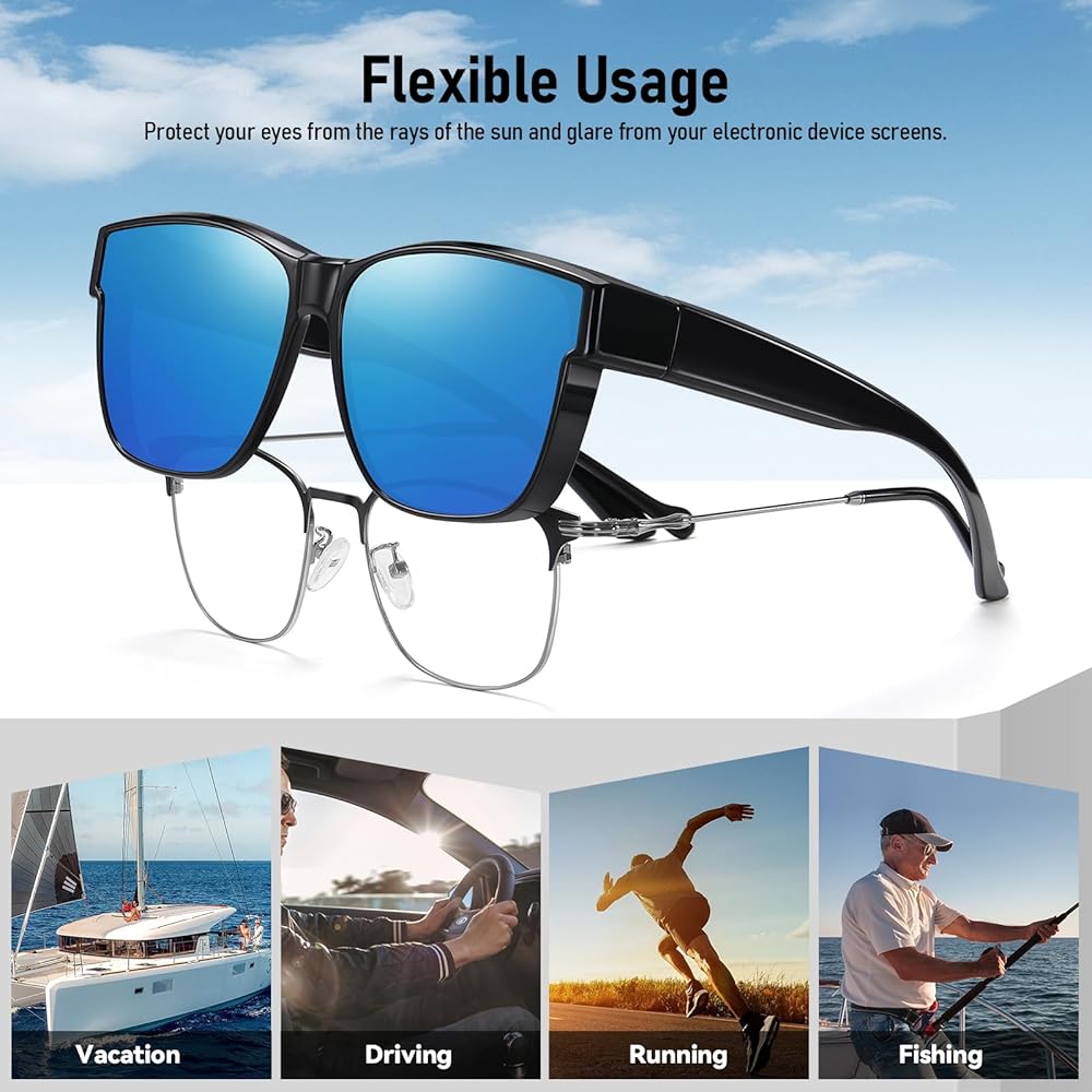 🔺【النظارات الشمسية فوق النظارات】: تعتبر النظارات الشمسية المستقطبة فوق النظارات خيارًا مثاليًا إذا كان عليك ارتداء نظارات قصر النظر/القراءة في الهواء الطلق ولا ترغب في ارتداء عدسات مثبتة. حماية العينين بشكل فعال من أضرار أشعة الشمس! يضمن إطار TR90 المتين المرونة والراحة وخفة الوزن. خيارات الألوان المتعددة تلبي المناسبات والمتطلبات المختلفة، العدسات الداكنة أكثر ملاءمة للاستخدام في ضوء الشمس القوي، بينما العدسات الفاتحة أكثر ملاءمة للاستخدام في البيئات الغائمة أو الإضاءة المنخفضة.