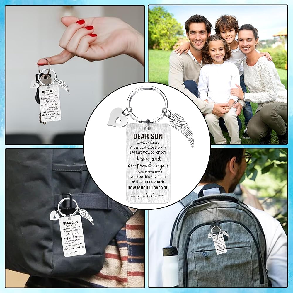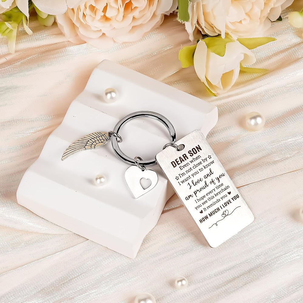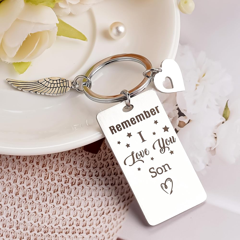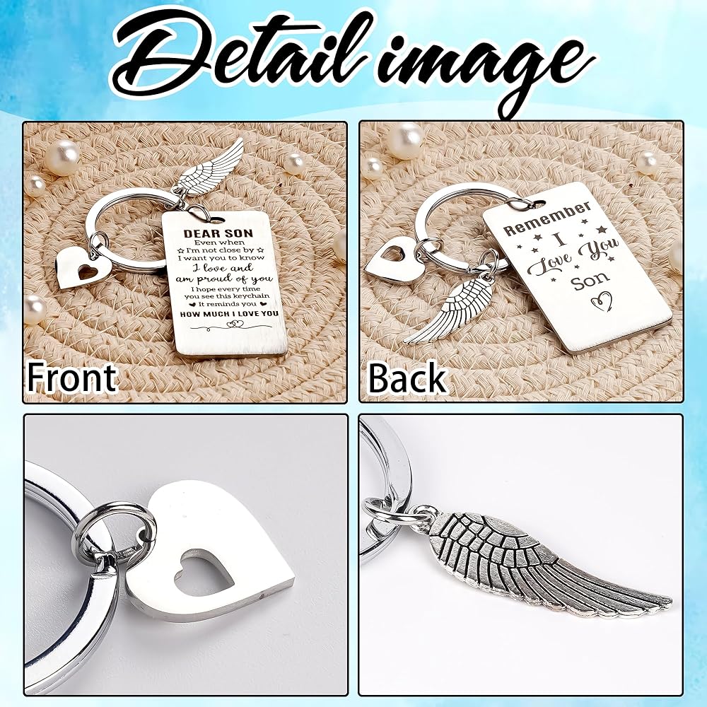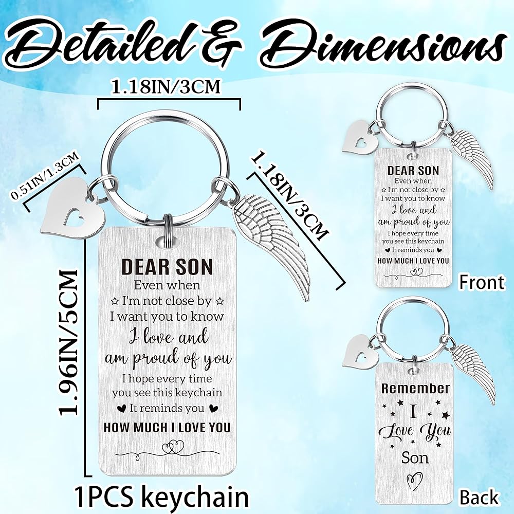 رسالة حب على الوجهين: تتميز سلسلة المفاتيح هذه بنقش أمامي مكتوب عليه، "ابني العزيز، حتى عندما لا أكون بجانبك، أنا أحبك، وأنا فخور جدًا بك. في كل مرة ترى هذا." يقول الجزء الخلفي، "تذكر، أنا أحبك، يا بني"، مما يخلق تذكيرًا من القلب من أي زاوية