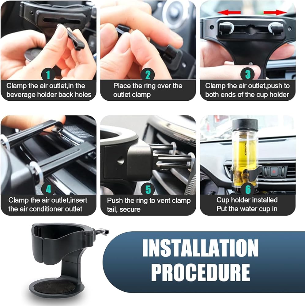 Simple Installation: First, insert the air outlet clip into the small hole on the back of the cup holder. Then fix the ring on the air outlet holder. The third step is to push the air outlet clip to both sides of the cup holder. Finally, insert the air outlet clip into the surface of the car air conditioner outlet, push the ring to the end of the air outlet clip and fix it.