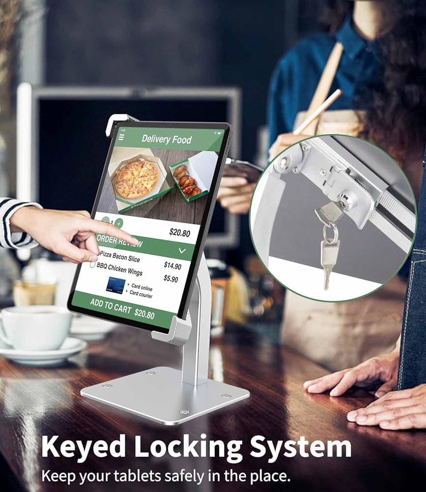 【مضاد للسرقة والأمان】حامل تابلت قابل للقفل مع قفل ومفتاحين، لا يمكن فتح مشبك التابلت بدون مفتاح، لذلك لا داعي للقلق بشأن السرقة أو السقوط. مثالي للمكاتب ومتاجر التجزئة والفنادق والمدارس والكنائس والمكتبات والمقاهي والمستشفيات والمطاعم والمطابخ والعروض والمؤتمرات والفعاليات والمعارض التجارية والندوات أو الاستخدام الشخصي وما إلى ذلك.