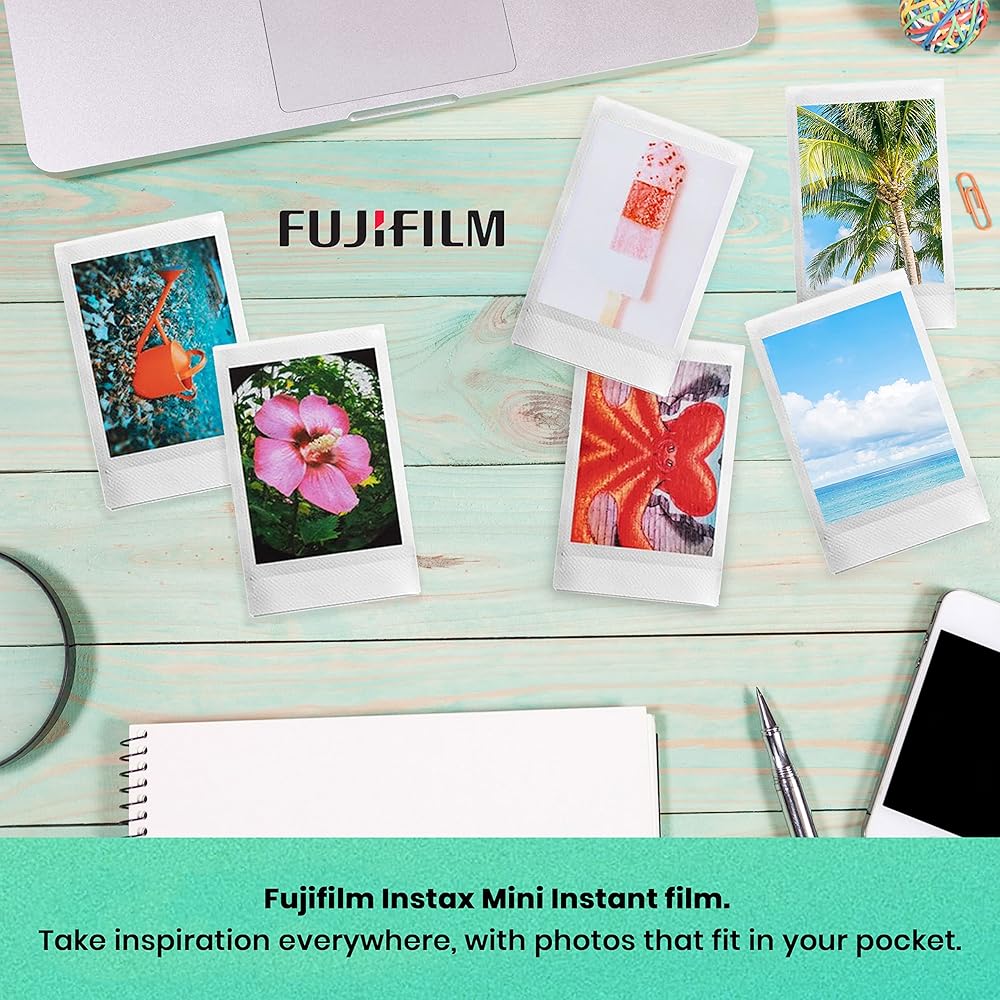 تتضمن المجموعة - كاميرا Fuji Mini 11 الفورية، مطبوعات Fuji الفورية 20 ورقة، إطار Instax، مشبك مطبوعات صغير، حامل باقة أفلام Instax Mini.
