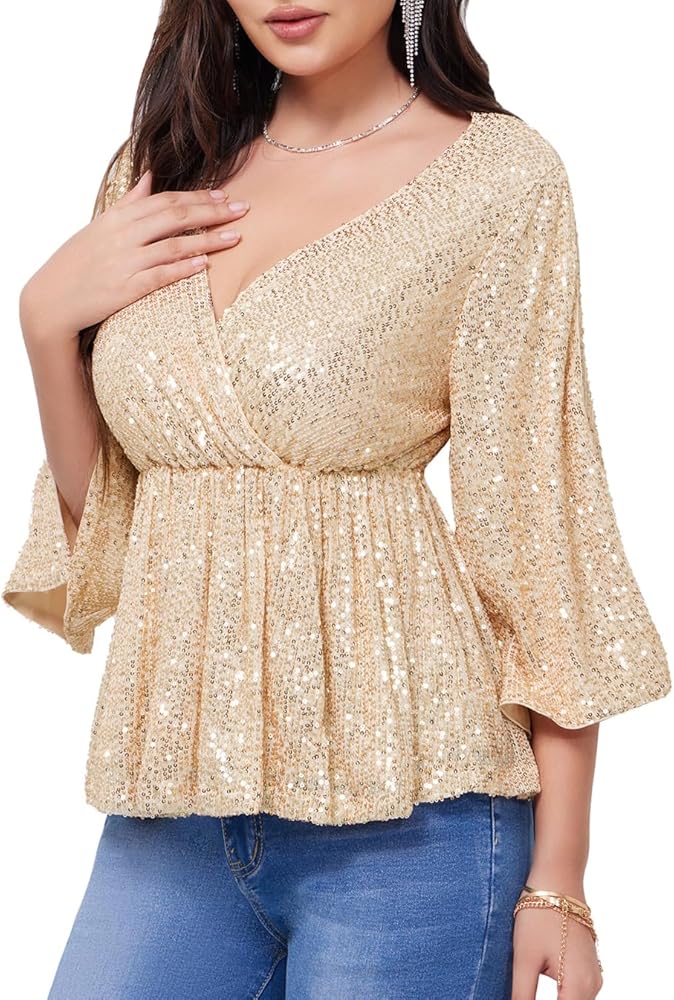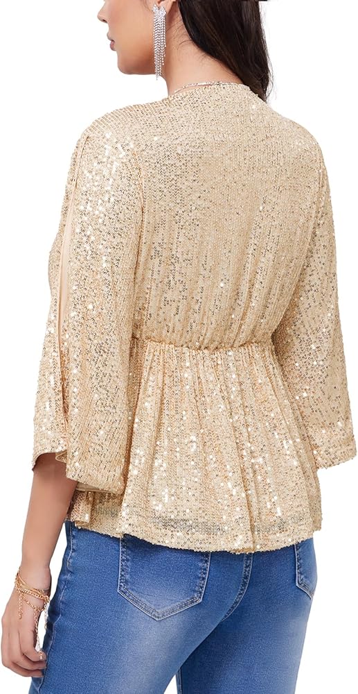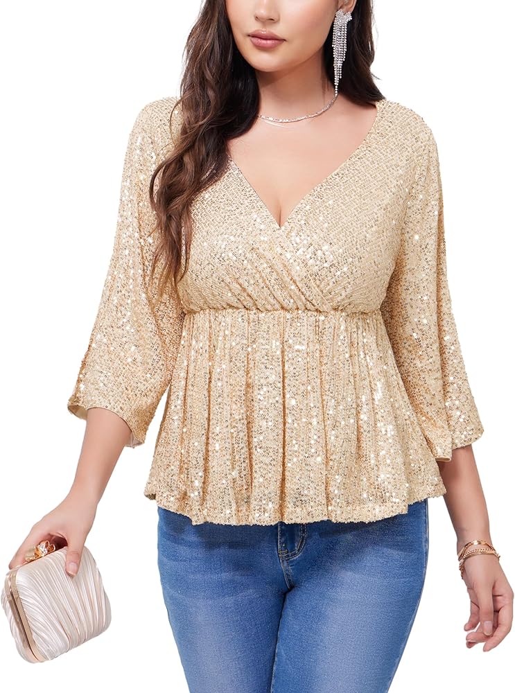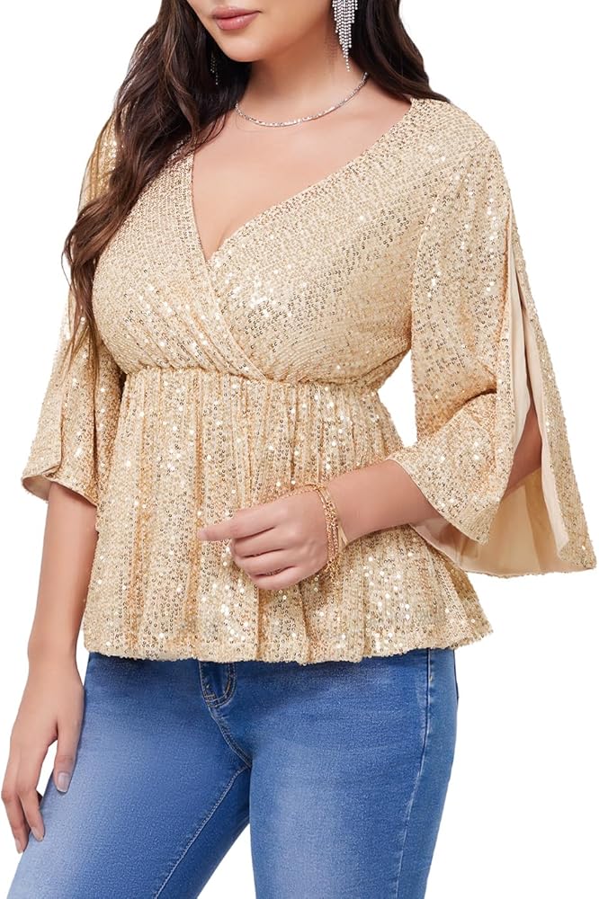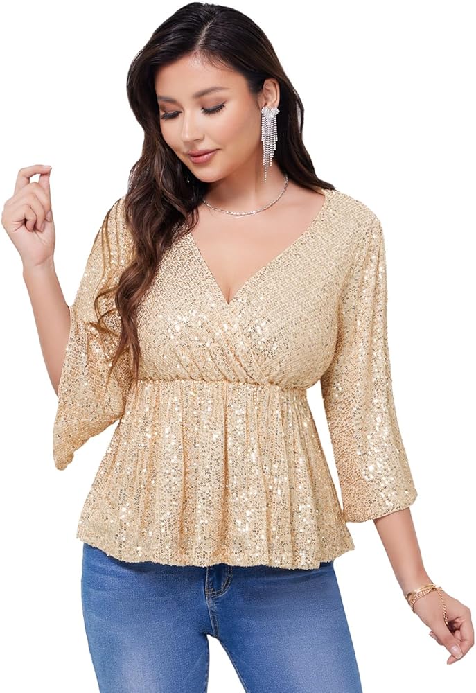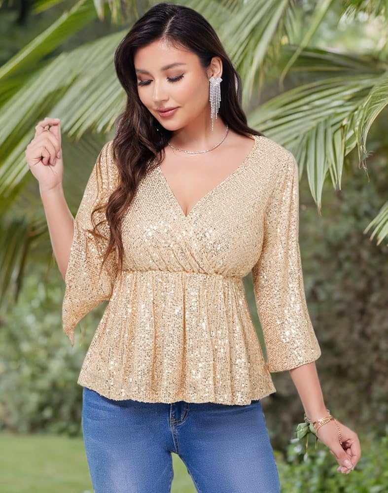 • Design:Glitter tops and blouses for women designed with V-neckline,Split 3/4 Sleeve,Wrap-front style,elastic waist can make more comfortable wear feeling and features side zipper can take on and off easily,ruffle hem