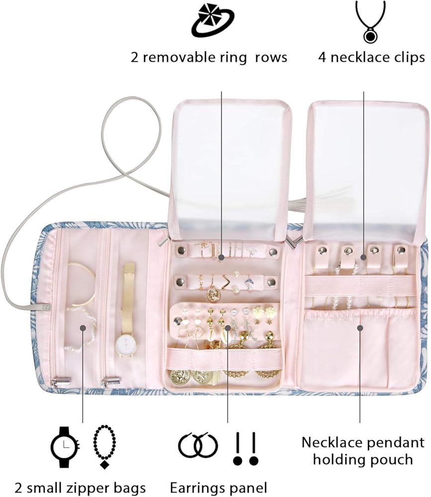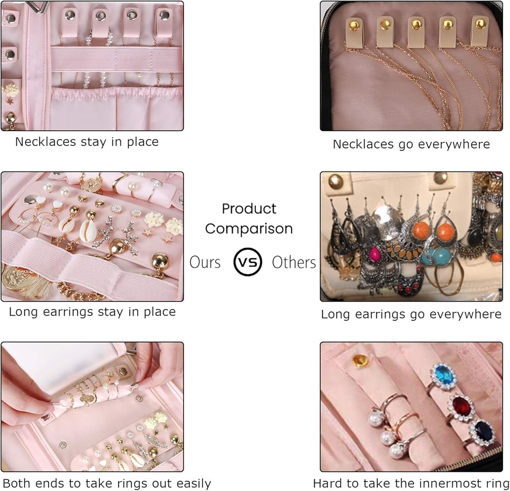 • حجم واسع - 4 مشابك للقلادة خالية من التشابك + 2 شريط حلقي قابل للإزالة + 24 فتحة من الأقراط مع مطاط + 2 جيب طويل بسحّاب.