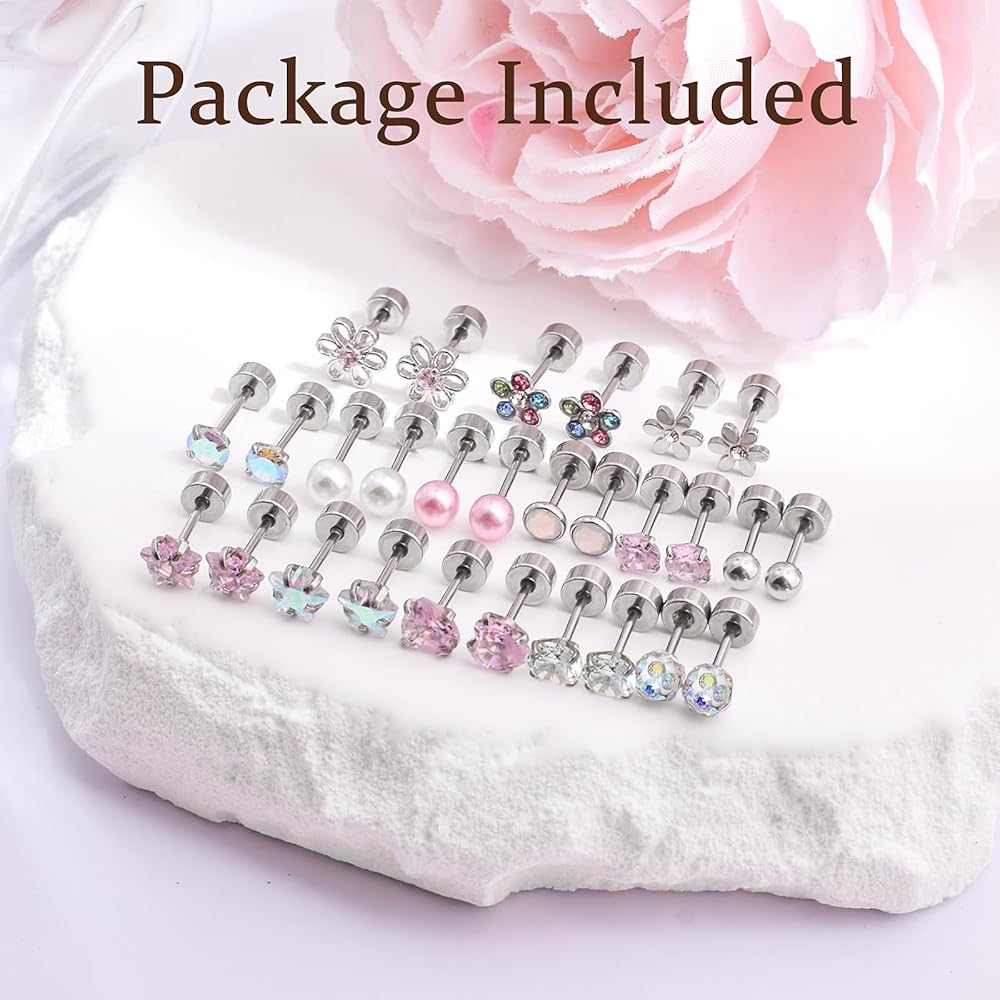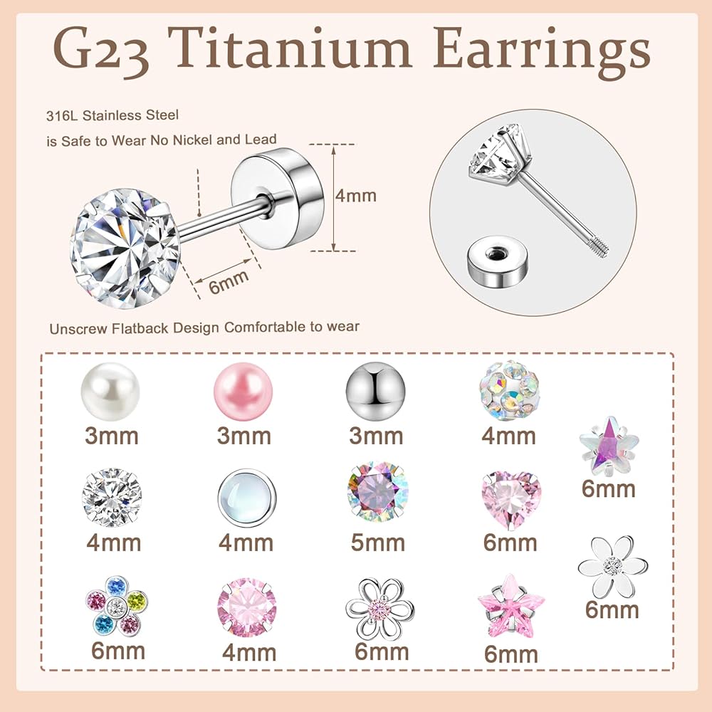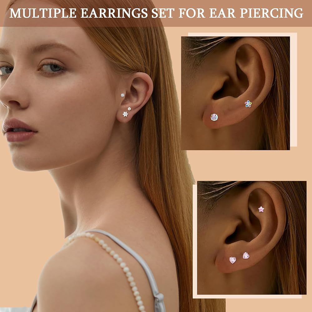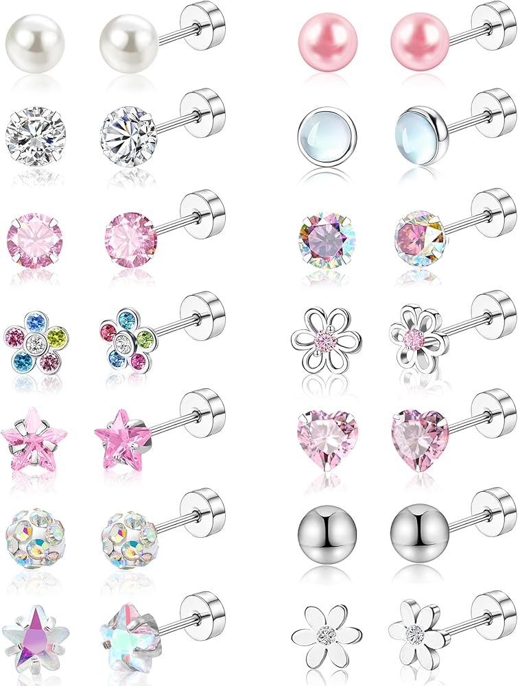مجموعة من 14 زوجًا من الأقراط المرصعة، حلق غضروف 316L، أقراط خلفية لولبية للنساء 3-6 مم، مجموعة صغيرة من الأقراط الخلفية المسطحة باللون الوردي، هدية لها