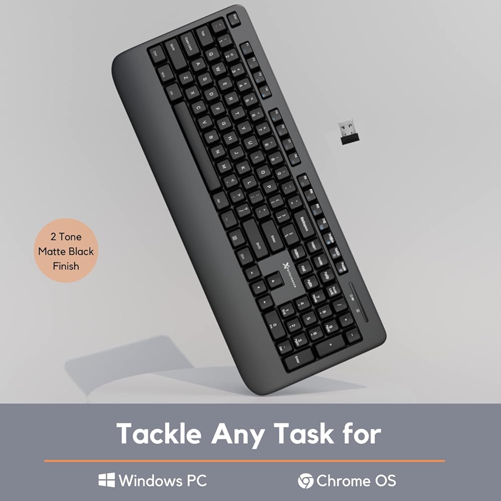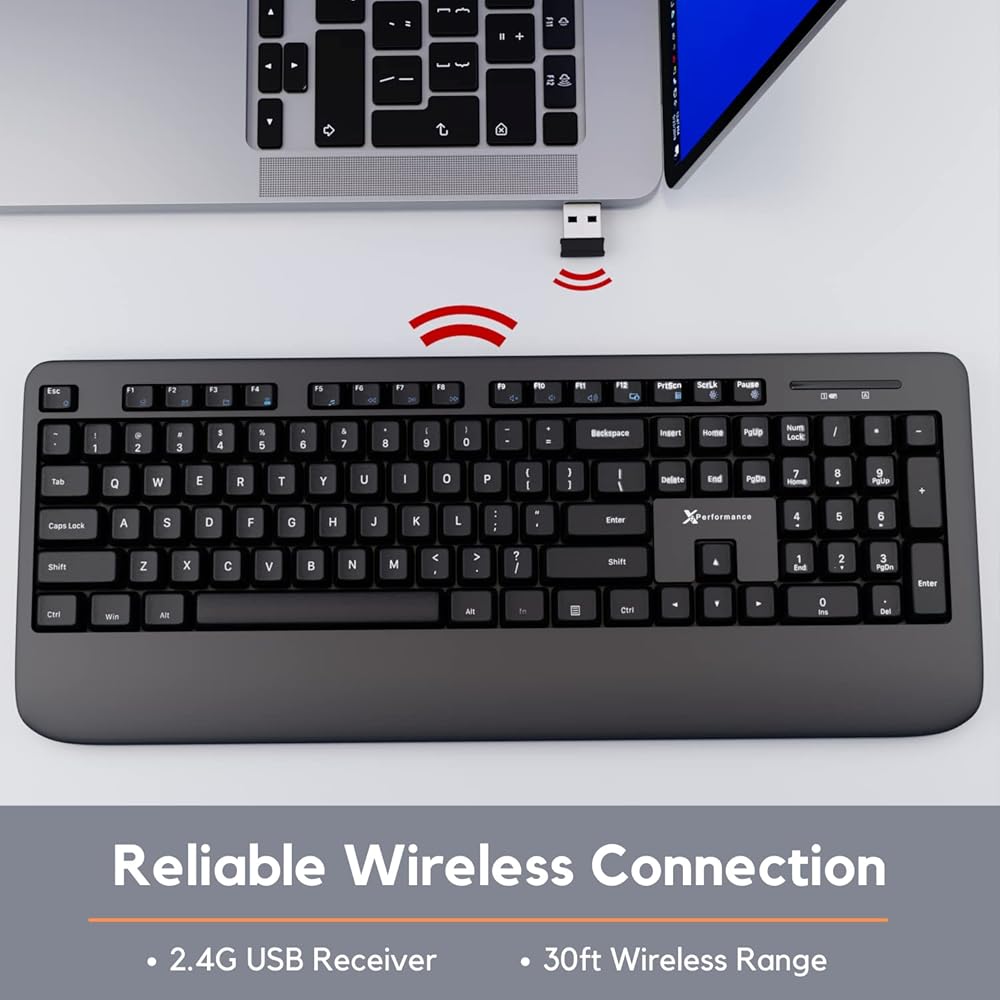 Introducing the Wireless Keyboard, designed for maximum comfort with innovative ergonomic features to keep your hands in a neutral position and ensure comfortable typing all day long. This wireless laptop keyboard is perfect for desktop computers and laptops alike, with its full-size keys and caps lock light indicator for improved accuracy. Enjoy an effortless typing experience with this USB ergonomic wireless keyboard featuring a palm rest for extra support. With no cords to worry about, you can easily set up your computer anywhere in your home or office. Get ready to type in style with this reliabl The X9 Performance X9RFPALMKEY A comfortable wireless keyboard with a soft palm cushion. Designed for Windows PC. Here is why the is for you. SOFT CUSHIONED PALM REST: The keyboard's wrist cushion and adjustable kickstand prevents wrist strain and allows you to type comfortably for hours. RF WIRELESS TECHNOLOGY: 2.4Ghz connection via USB dongle (30ft range). EFFECTIVE LAYOUT: A 104-key layout with a numeric keypad gives you the ability to easily complete all types of computer work. 16 SHORTCUT/MULTIMEDIA KEYS: Work efficiently. With 16 hotkeys, you will have access commands and gestures with one touch. LED INDICATORS: For num lock, caps lock, and low battery EASY SETUP: Simple plug and play for any Windows laptop or computer with a USB port. witeless keyboard, wireless usb keyboard, comfort keyboard, economic keyboard, keyboard for laptop computer wireless, wireless laptop keyboard, keyboard comfort, wireless erogonic keyboard, wireless keyboard for laptop computer, full size computer keyboard, wireless keyboard with caps lock light, ergonomic keyboard usb, wireless keyboard with palm rest, cordless keyboards for computers.