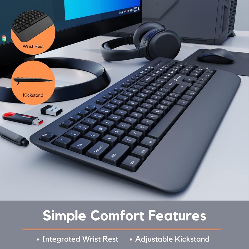 • الراحة تلتقي بالإنتاجية: تغلب على عبء عملك بشكل مريح. مصممة لأجهزة الكمبيوتر التي تعمل بنظام ويندوز ومصممة بوسادة معصم ومساند قابلة للتعديل، كيبورد الكمبيوتر اللاسلكي الخاصة بنا مريحة للاستخدام لساعات العمل الطويلة.