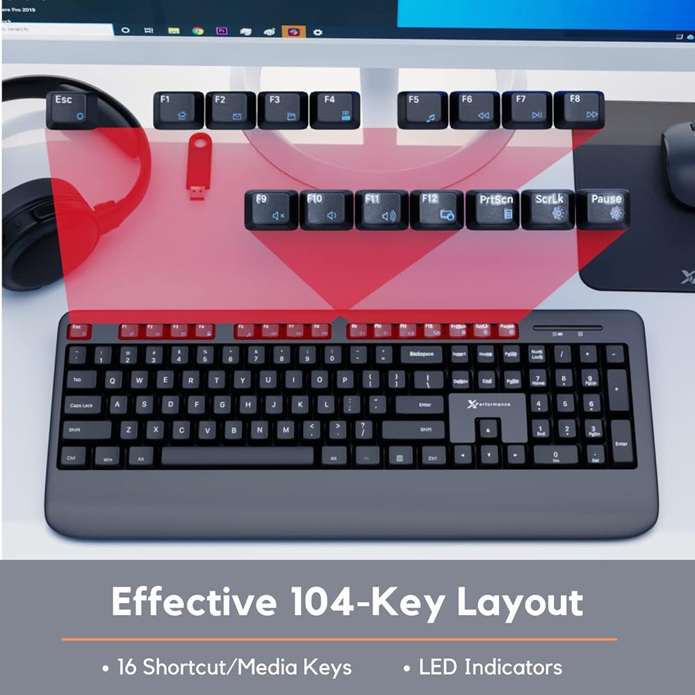 اكس 9 بيرفورمنس كيبورد لاسلكي مريح مع مسند للمعصم - راحة مع الانتاجية - كيبورد USB لاسلكي مع 104 مفتاح و2 نغمة لامعة بلمسة نهائية غير لامعة - كيبورد كمبيوتر بتردد 2.4G للكمبيوتر واللابتوب