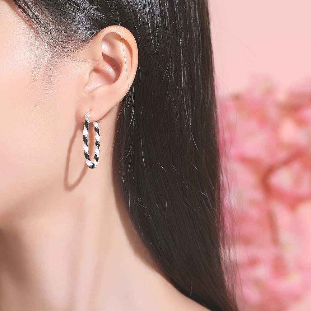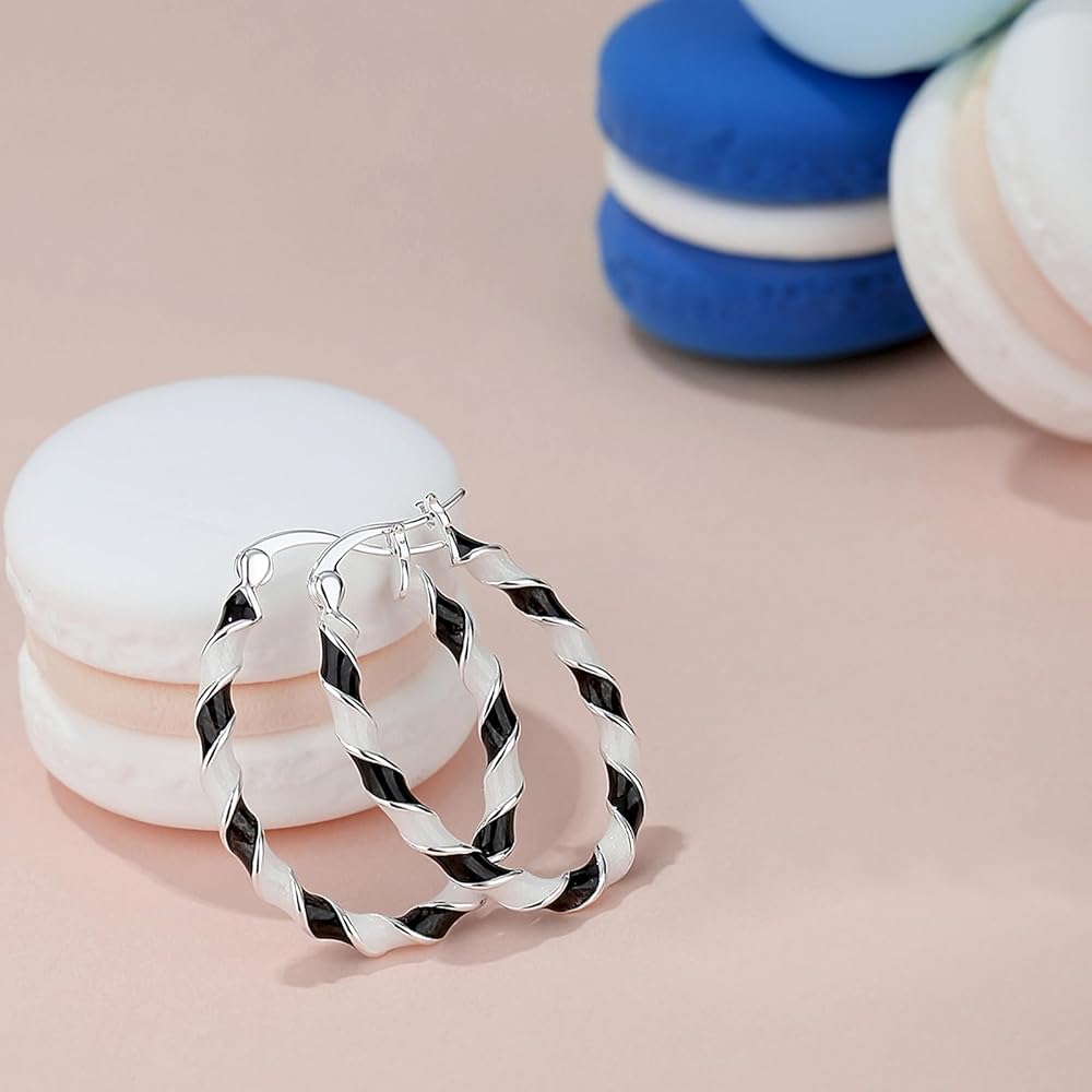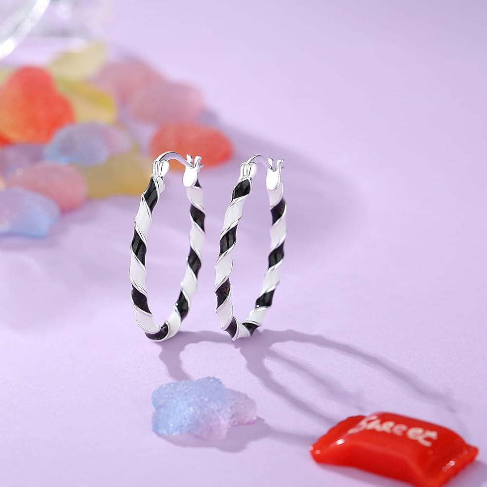 • 【أقراط باللونين الأسود والأبيض】: هذه الأقراط الكلاسيكية للعطلات للنساء مصنوعة من النحاس. تضيف الأطواق الملتوية المطلية بالفضة إكسسوارًا بسيطًا وسهلاً للأزياء اليومية.