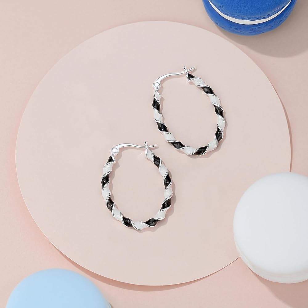 MUYUU المينا هوب أقراط-أقراط مطلية بالفضة باللونين الأسود والأبيض للنساء-حلقات القرط البيضاوية الساحرة