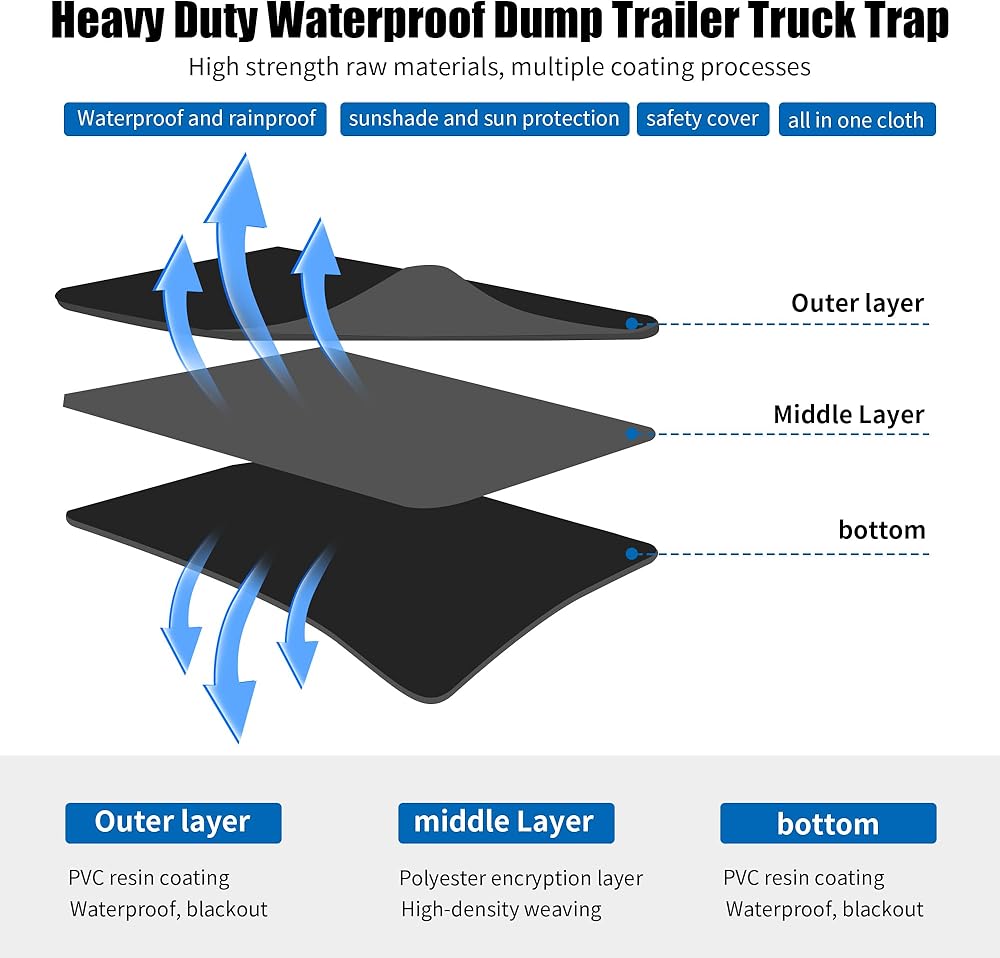 【حماية شديدة التحمل】أغطية المقطورة القلابة مصنوعة بنسبة 100% من مادة نسيج PVC عالية الكثافة الجديدة مما يجعلها متينة للغاية. إنه يتمتع بمقاومة ممتازة ضد التمزق والأشعة فوق البنفسجية والرياح وتأثير درجات الحرارة العالية/المنخفضة. تم تصنيع أقمشة الشاحنات السوداء هذه بزوايا معززة وحواشٍ من البولي بروبيلين مزدوجة الخياطة لتحقيق أقصى قدر من المتانة طويلة الأمد.