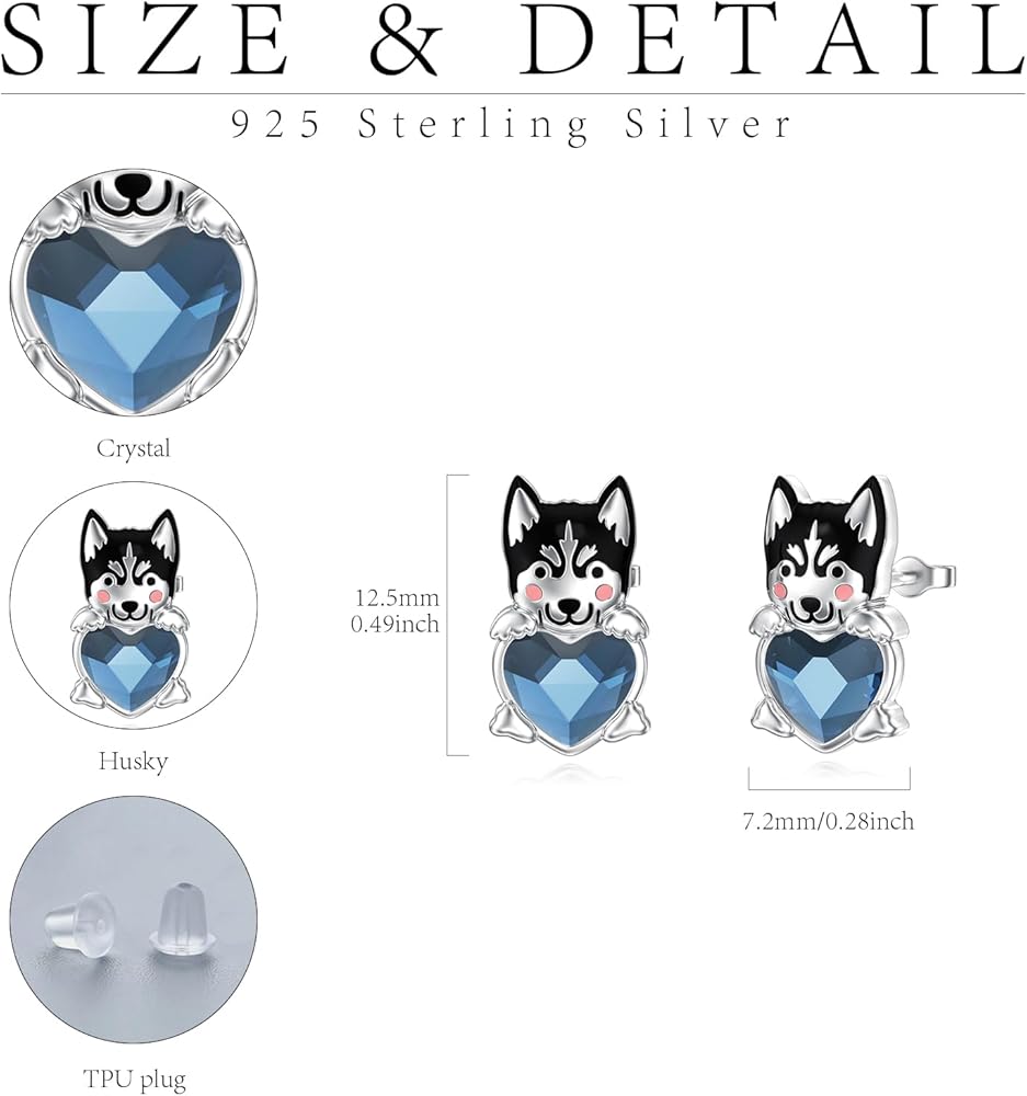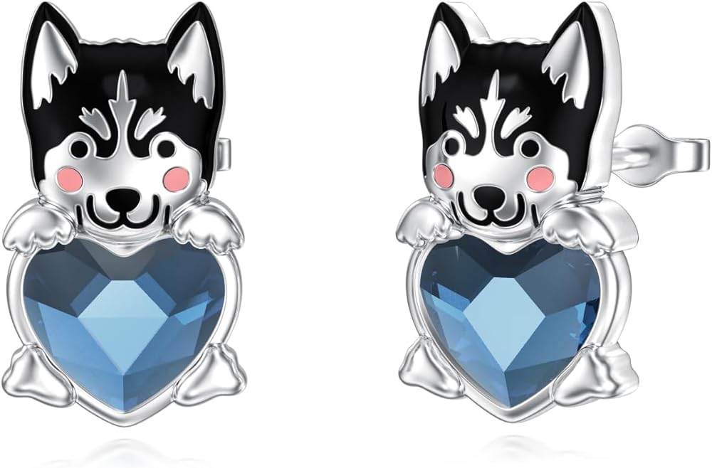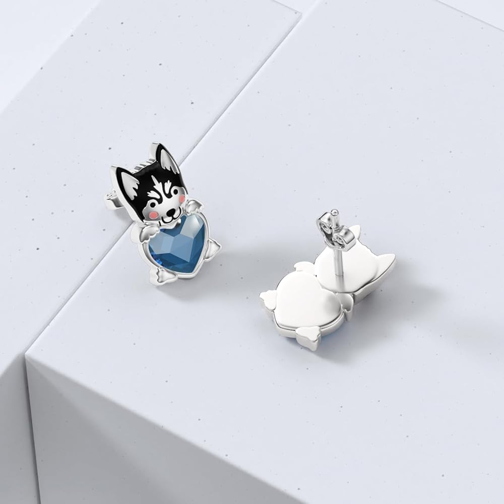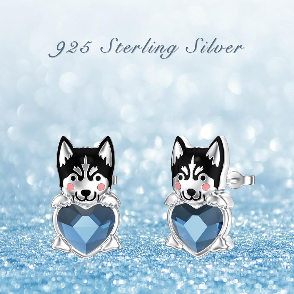 Adorable Design: These charming 925 sterling silver stud earrings feature a delightful schnauzer dog design, hugging a sparkling blue heart-shaped crystal.
