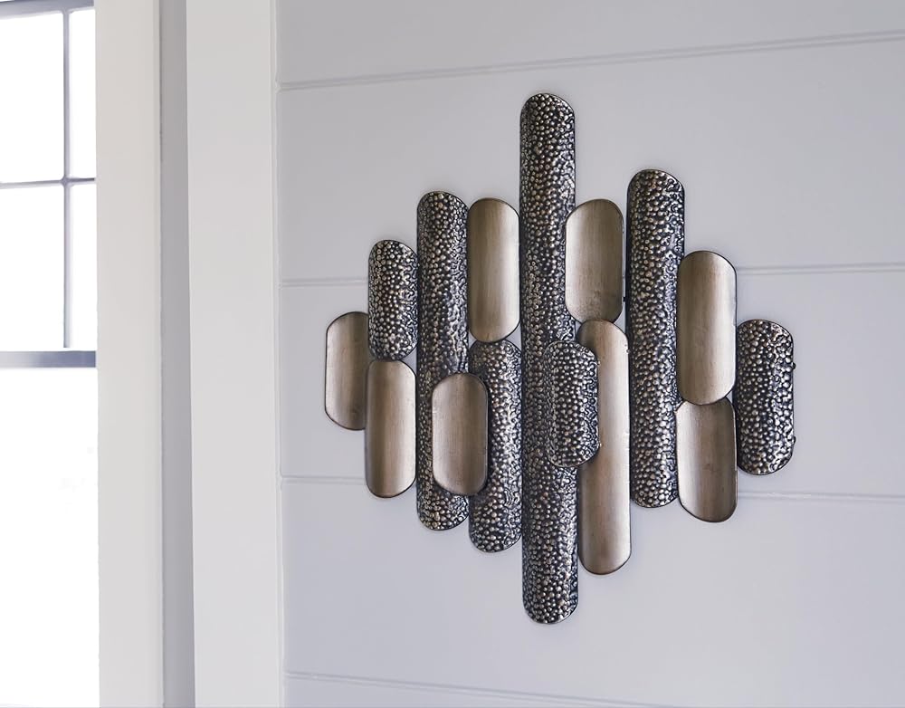Imagine bringing home an upscale art gallery look at a price that's just your style. That's the beauty of this wall sculpture. Its geometric design, with interlocking metal shapes in an antiqued black and champagne finish, is a cool accent choice for contemporary spaces.