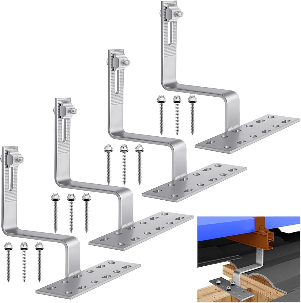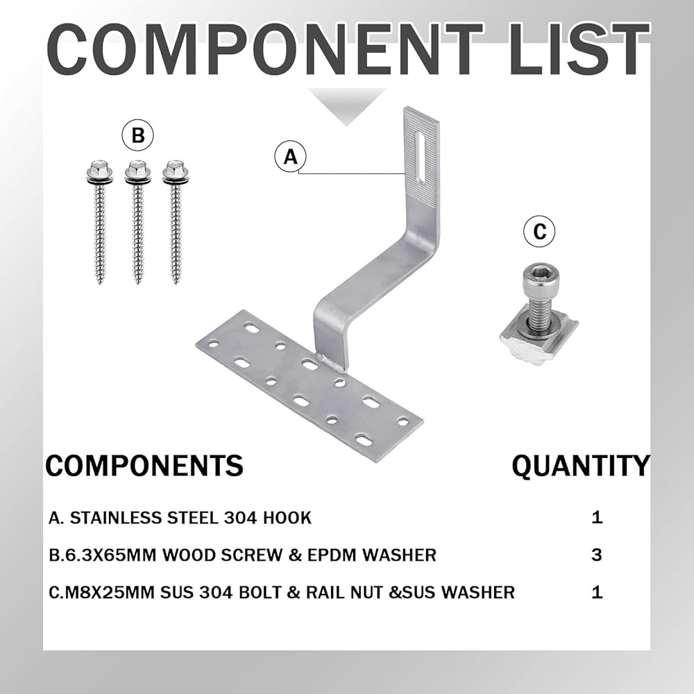 • Quality Material and Comprehensive Package: made of 304 stainless steel, our solar panel roof hooks are rust free and robust, crafted for weather resistance and durability; The package includes 4 stainless steel tile roof hooks set, each set includes 1 solar panel roof hook, 3 wood screws with EPDM washer, 1 pcs 304 stainless steel bolt, and 1 guide rail nut with stainless steel washer