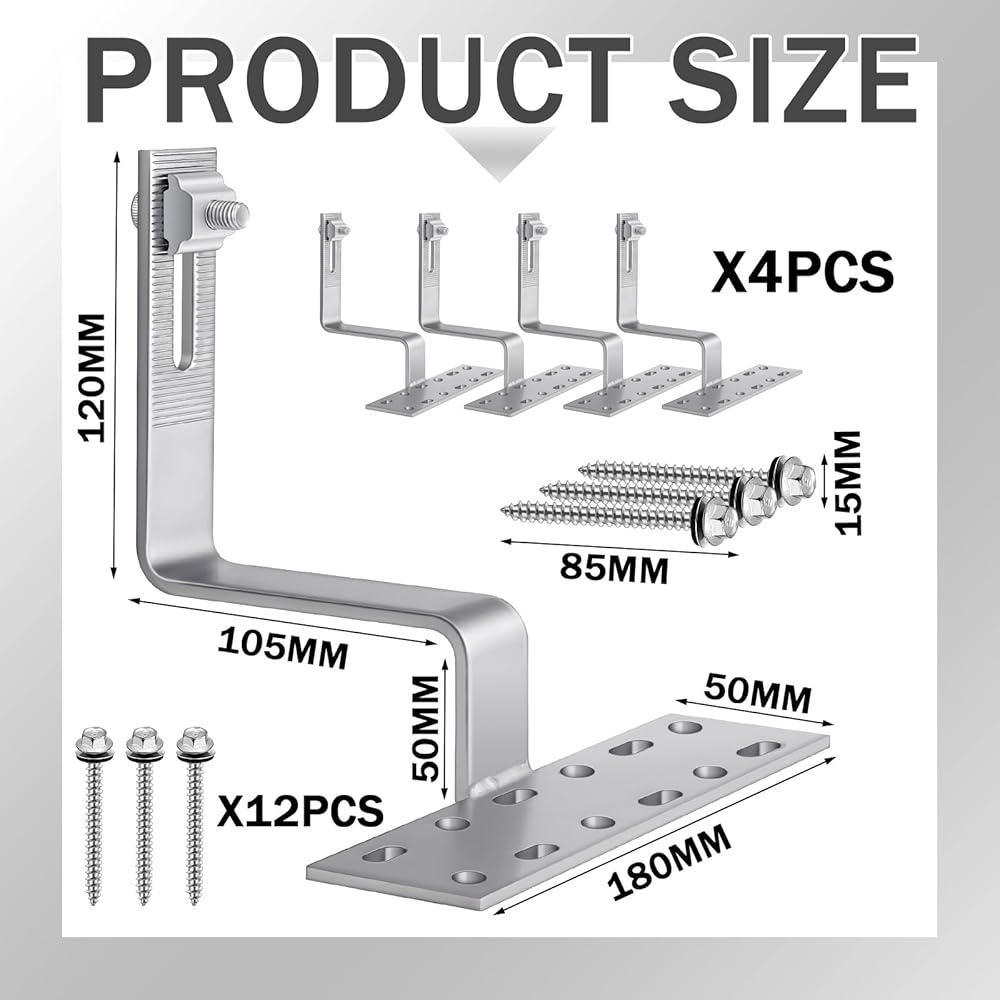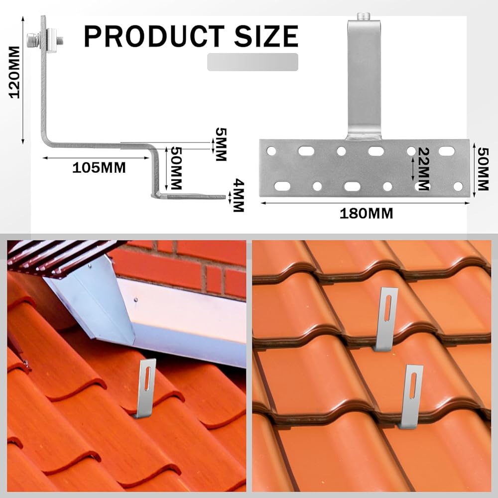 • Versatile and Functional Design: designed to enable installing 2 PV panels and works well with large sized tile roofs, these stainless steel roof tile hooks are versatile enough to work with flat, S, and W shaped tile roofs; The practical construction aims for the installation of aluminum rails, profile rails, mounting rails for mounting photovoltaic modules or solar energy systems