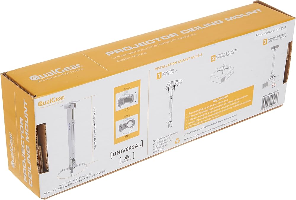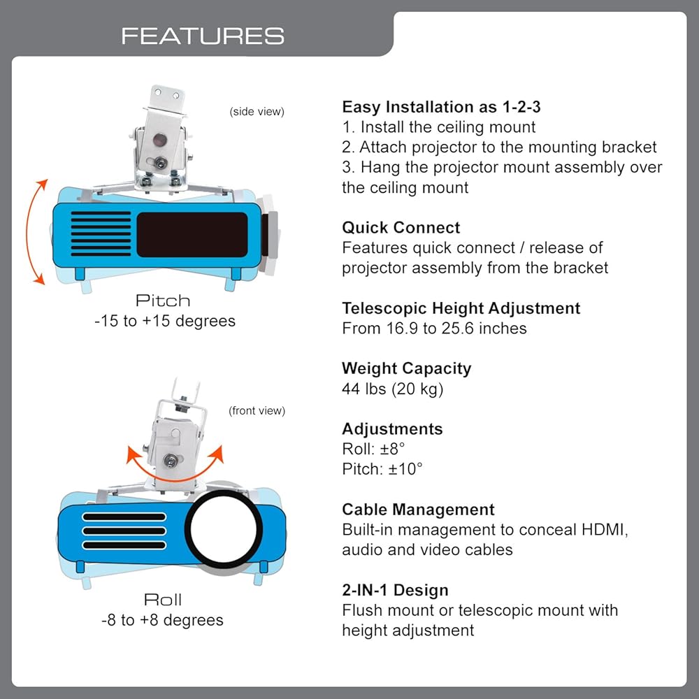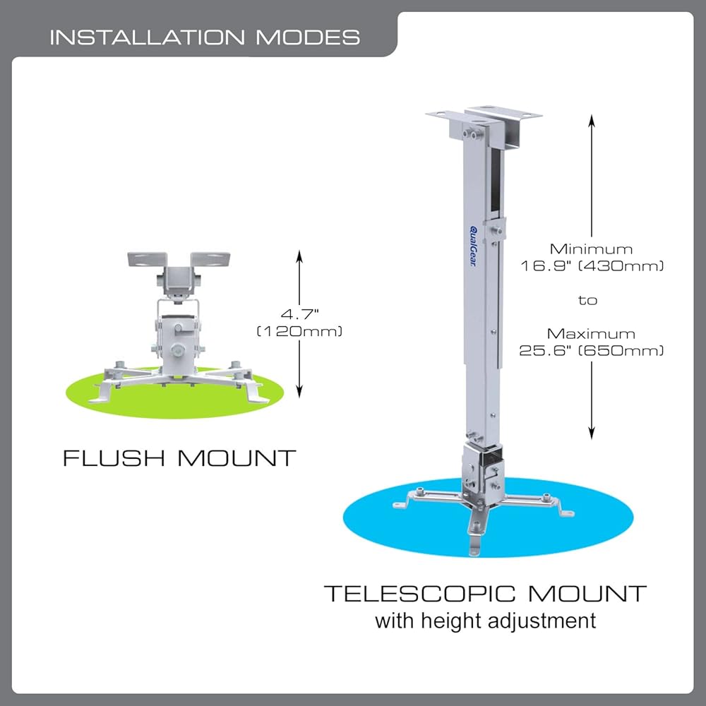 حامل سقف لجهاز العرض لتركيب أجهزة عرض الفيديو DLP/LCD على السقف. البناء الصلب المدرفلة على البارد. اهتزازات معدومة تقريبًا مقارنة بنماذج الألومنيوم. خيار مثالي للفصول الدراسية والمسارح المنزلية.