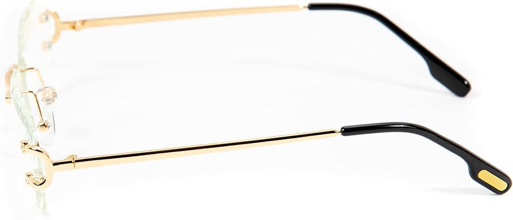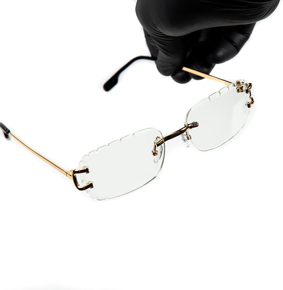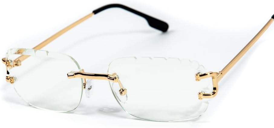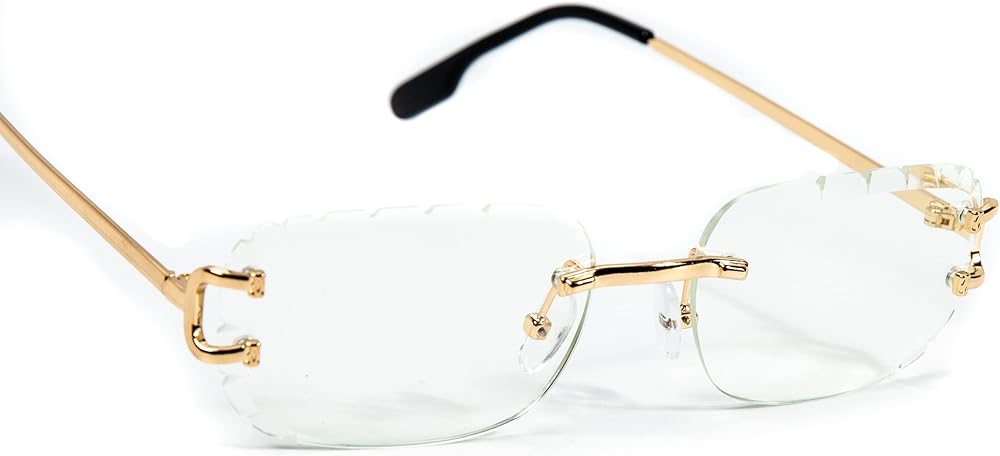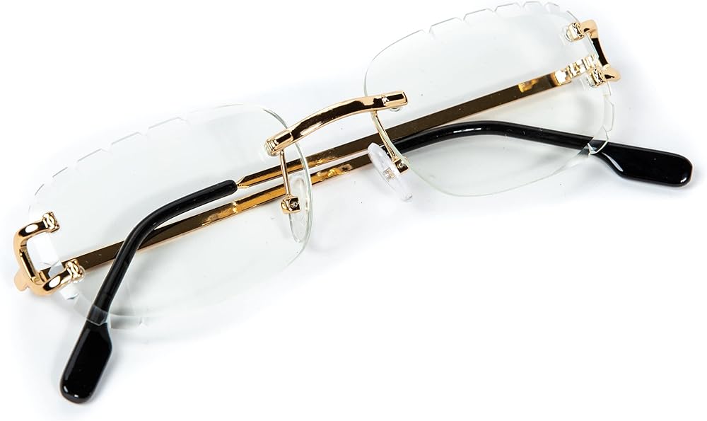 Rectangular Unisex Rimless Gold Wire Frame Luxury Trendy Old School Retro 90's Frameless Gem Cut Clear Lens Hip Hop Diamond Cut Eye Glasses For Men Women STYLISH RIMLESS CLEAR GEM CUT SUNGLASSES: Celebrities SAME STYLE-The most cutting-edge fashion design-style multi-color jelly lens, a must-have in summer. The rectangle lens adds a retro and classic style. The rimless frame and gold wire frame temples make these small rectangle sunglasses look trendy, The simple and compact design makes our glasses look very stylish and exquisite, The candy color lens sunglasses can be used with many outfits HD UV400 PROTECTION : These vintage plastic imitation woodgrain legs small rectangle sunglasses can block 100% harmful UVA, UVB rays, protect your eyes against long-term UV damage, Color Tint Lens while blocking UVA/UVB, not make the entire vision all dark. A high-definition lens allows you to better observe the scenery in the sun, ensure clear vision and more natural vision sight OCCASION: These small fashion rimless clear tint glasses for men and women are ideal for different activities such as parties, photo booths, travel, shopping, and other activities. It is suitable for any face to show a unique and fashionable lifestyle, It is also a great gift idea for your families and friends. Great for summer events, everyday wear, retro-themed costume, music festivals, hippie costume, and other themed events Lightweight And Durable: The colorful rimless rectangle sunglasses are with the most cutting-edge design style, very lightweight frames, and wood Temples give you a stress-free wearing experience, reinforced metal hinges are designed to prevent the loosening of screws, make the sunglasses more stable, and look more fashionable, High-quality polycarbonate lenses, comfortable silicone nose pads, ultra-light exquisite temples, all the details make it durable, shatterproof, and fashionable GUARANTEE: All STREET KNITTED customers enjoy free-risk shopping within 30 days, if you are not completely satisfied for any reason after the purchase, please feel free to contact us, we will reply within 24 hours, We provide a perfect after-sale service for all products