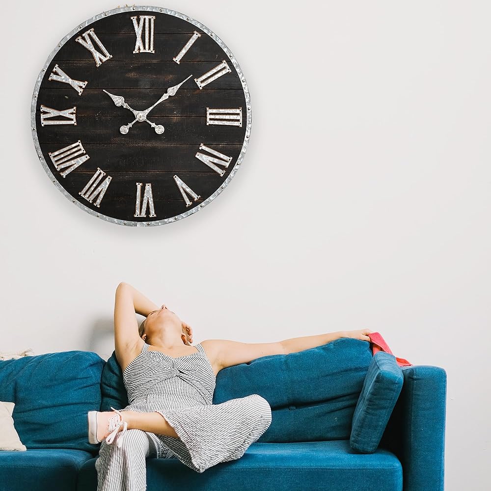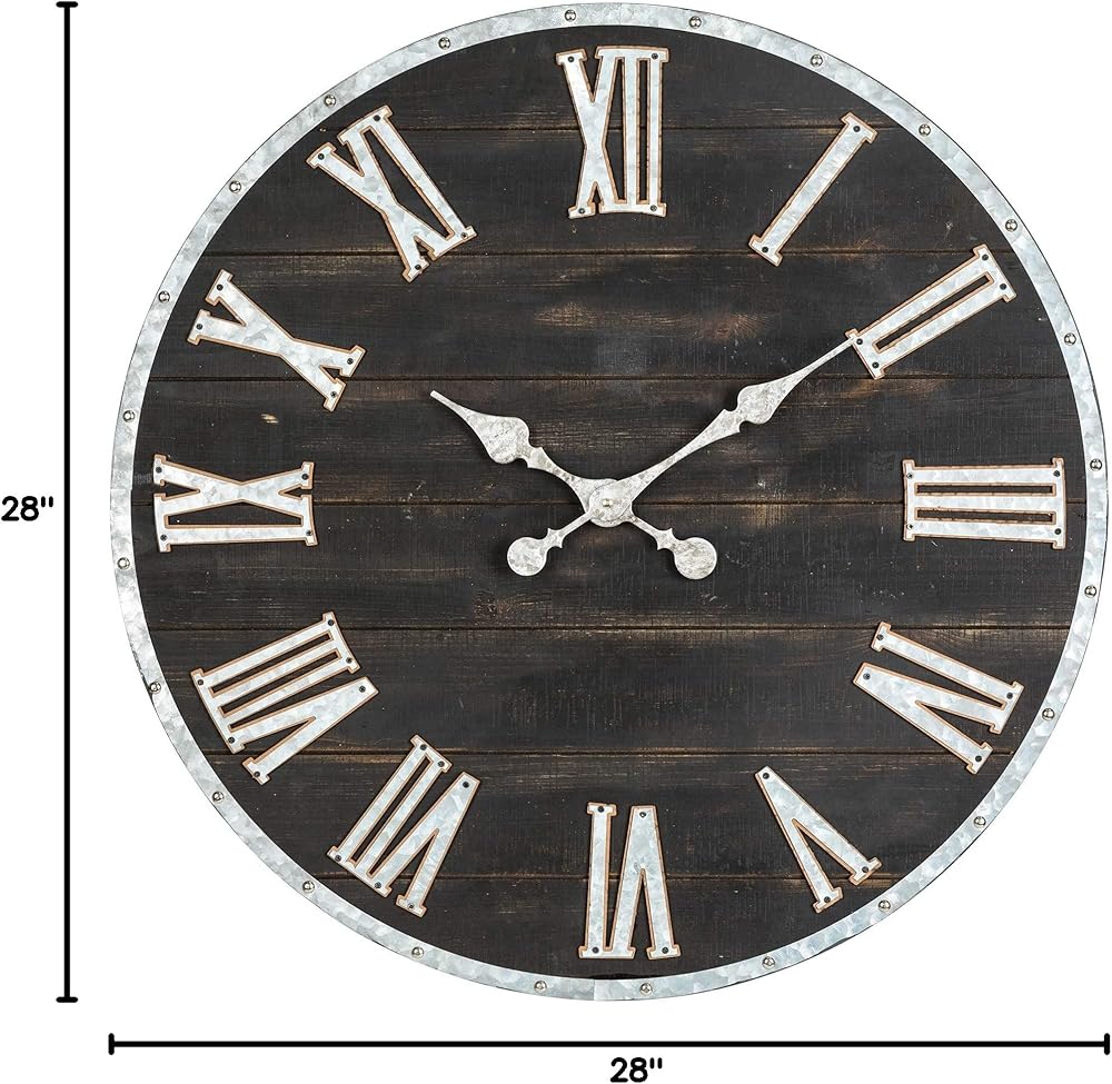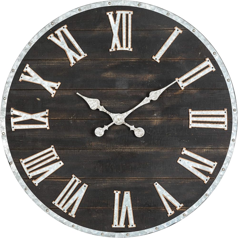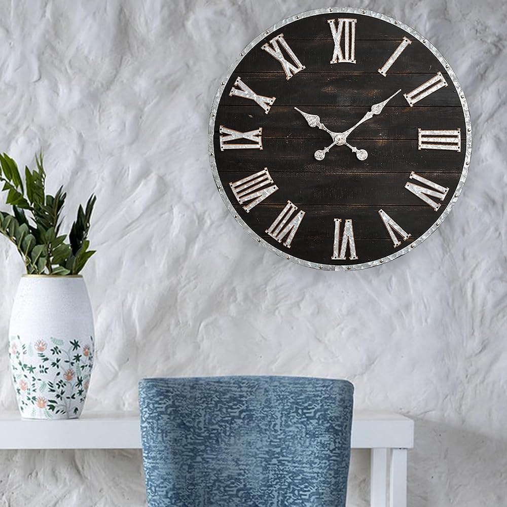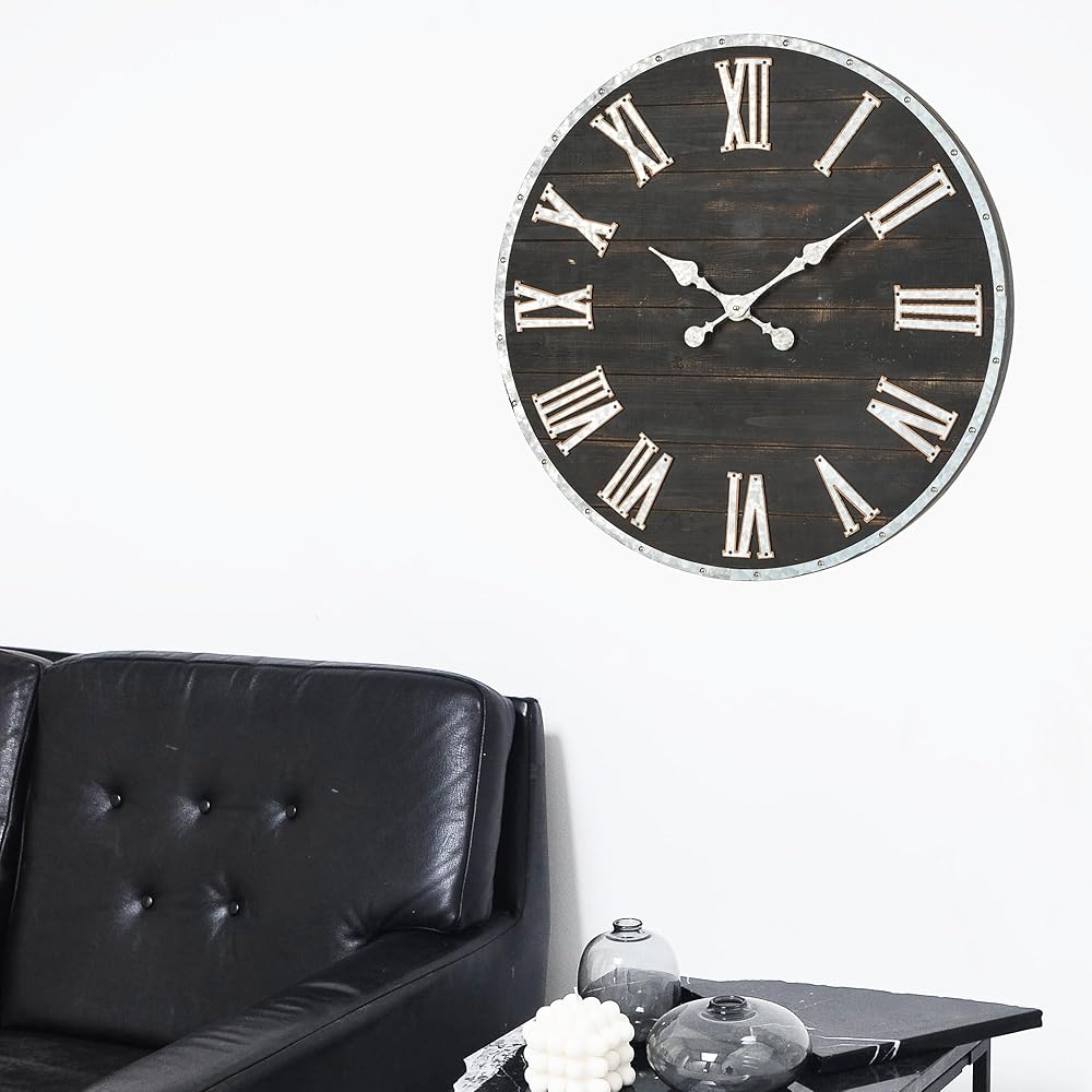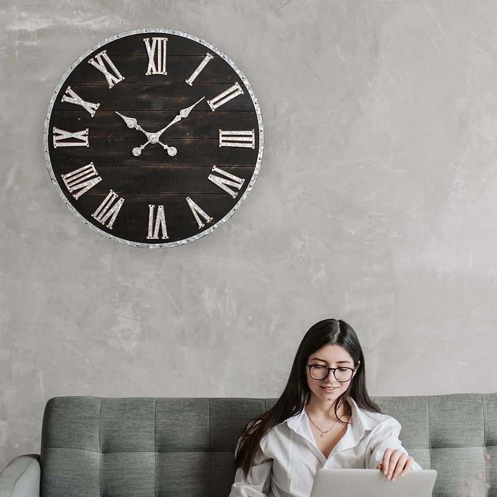 glitzhome 28 بوصة الأرقام الرومانية ساعة الحائط مزرعة ضخمة ساعة الحائط السوداء ريفي خشبي كبير أسود أبيض ساعات الحائط لغرفة المعيشة ديكور المدخل بطارية تعمل صامتة غير موقوتة ساعة معلقة