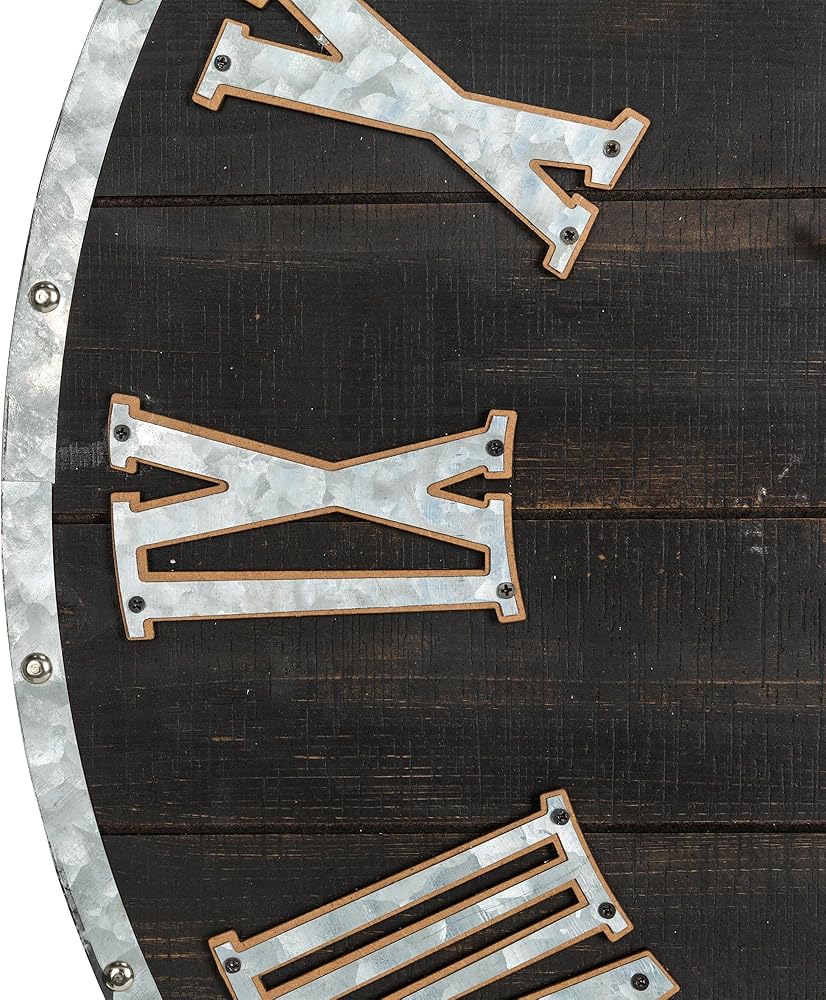 معدن خشبي ريفي --- مصنوع من الخشب والحديد عالي الجودة. مع خلفية خشبية بنية عتيقة مع زخرفة مجلفنة، ومزينة بأرقام رومانية مجلفنة كبيرة ووجه مفتوح، بغض النظر عن مكان وجود المؤشر، يمكن رؤيته في لمحة.