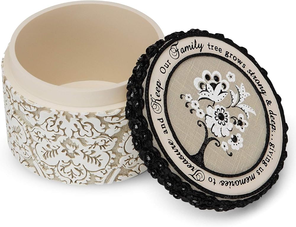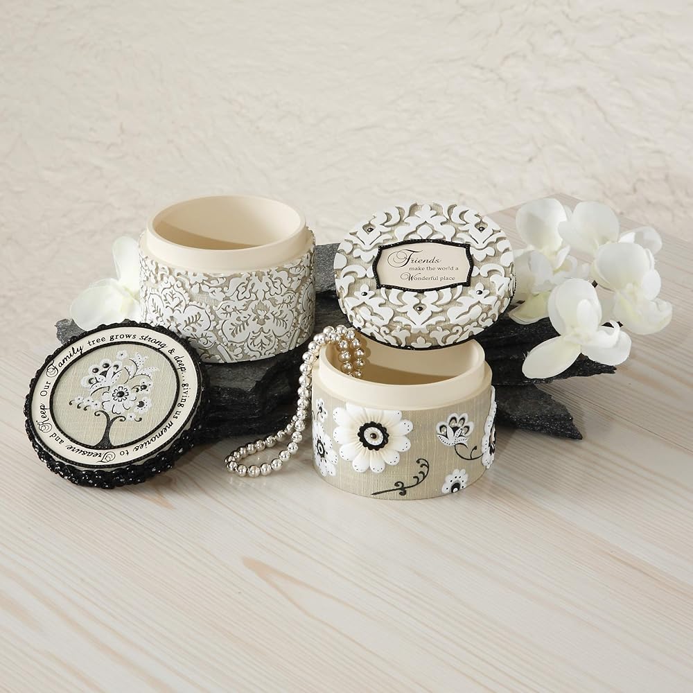 Modeles, French for "patterns" is a fresh collection of intricately hand crafted trinket boxes. Distinctive features of the line include crisp linen textures, mosaic glass, black gems and subtle neutrals combined with embossed patterns of striking floral and damask. This attractive piece has an elegant, classic beauty combined with contemporary simplicity giving the collection a timeless look.