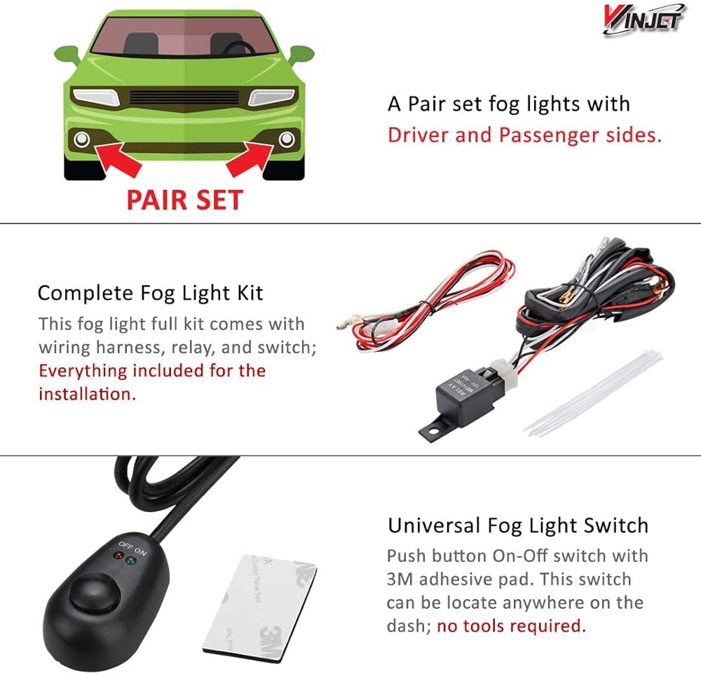 - Package Includes - One pair of fog lights (driver and passenger side) with halogen bulbs, On/Off switch, and wiring kit.